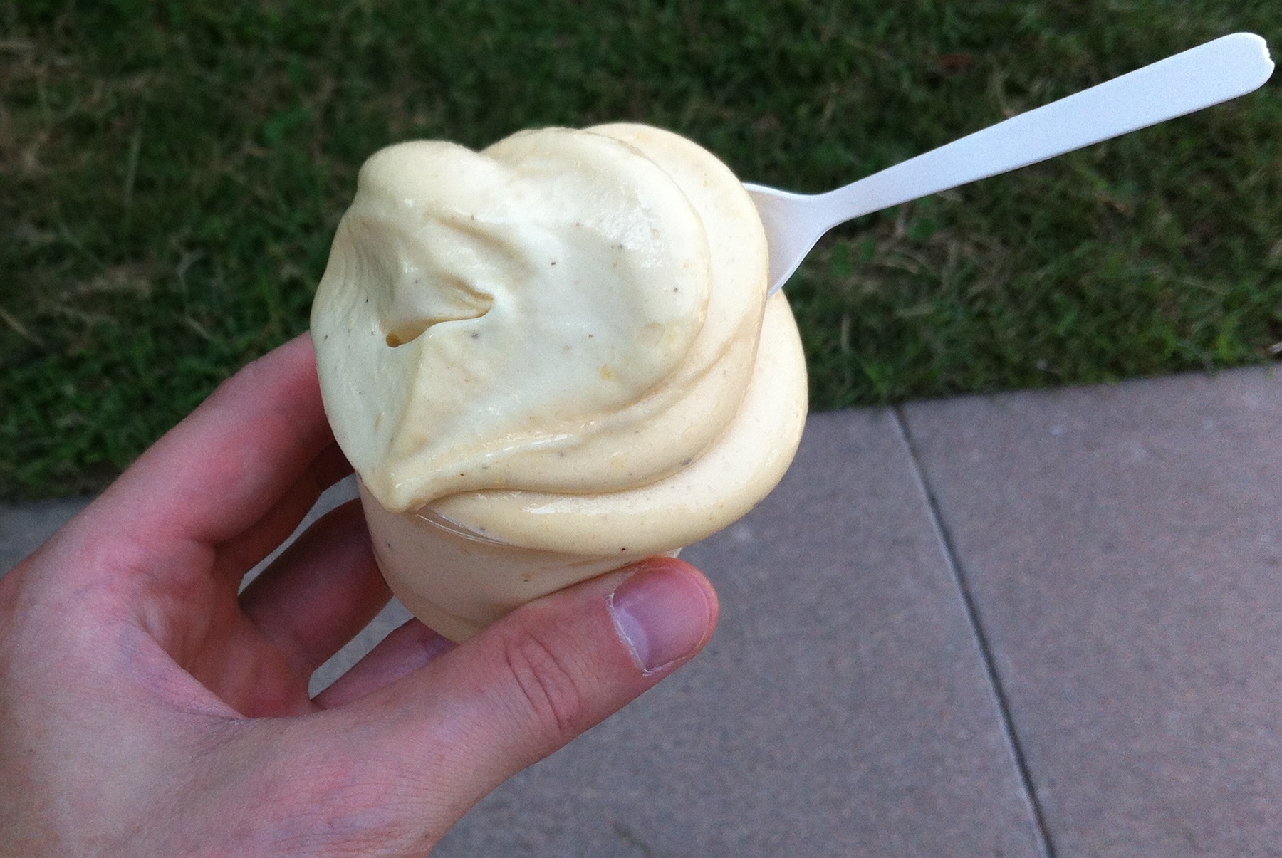 It says “100% healthy – 100% treat” on the truck. There was a dry erase board sign next to where you order and it said that it’s not ice cream, it’s not a smoothie, and it doesn’t contain any dairy. It’s hard to describe and a small cup was $4, but it was really, really good. I had the Pineapple – Peach, I think. I know it had pineapple but now I’m second guessing what the second fruit was.