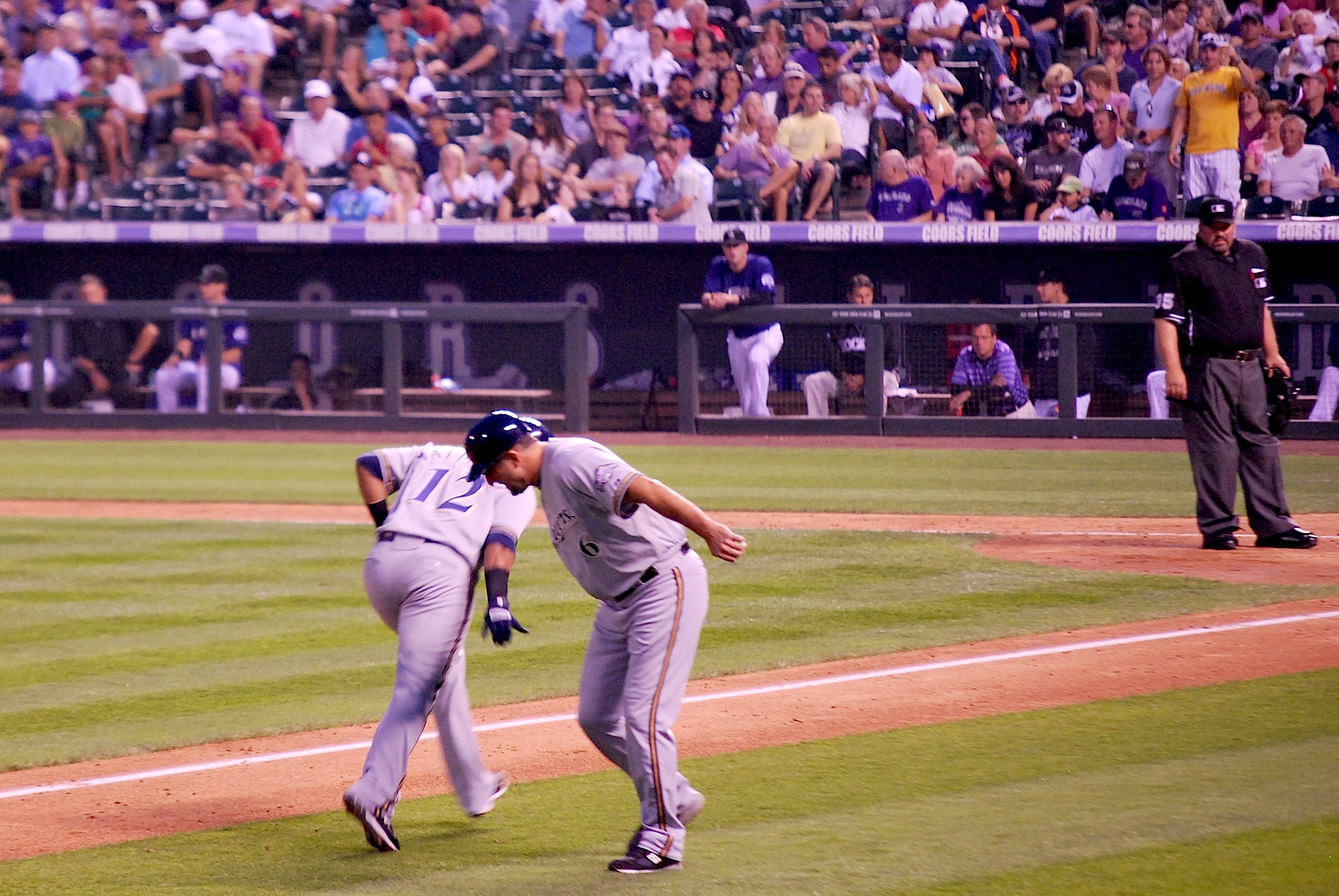 Randy Wolf gave up four runs in the 1st inning and again the Brewers found themselves in an early hole. In the top of the 3rd the Brewers scored a run but the Rockies returned the favor in the bottom half. In the 5th Martin Maldonado homered to lead off the frame, here he is just before getting a low five from Ed Sedar: