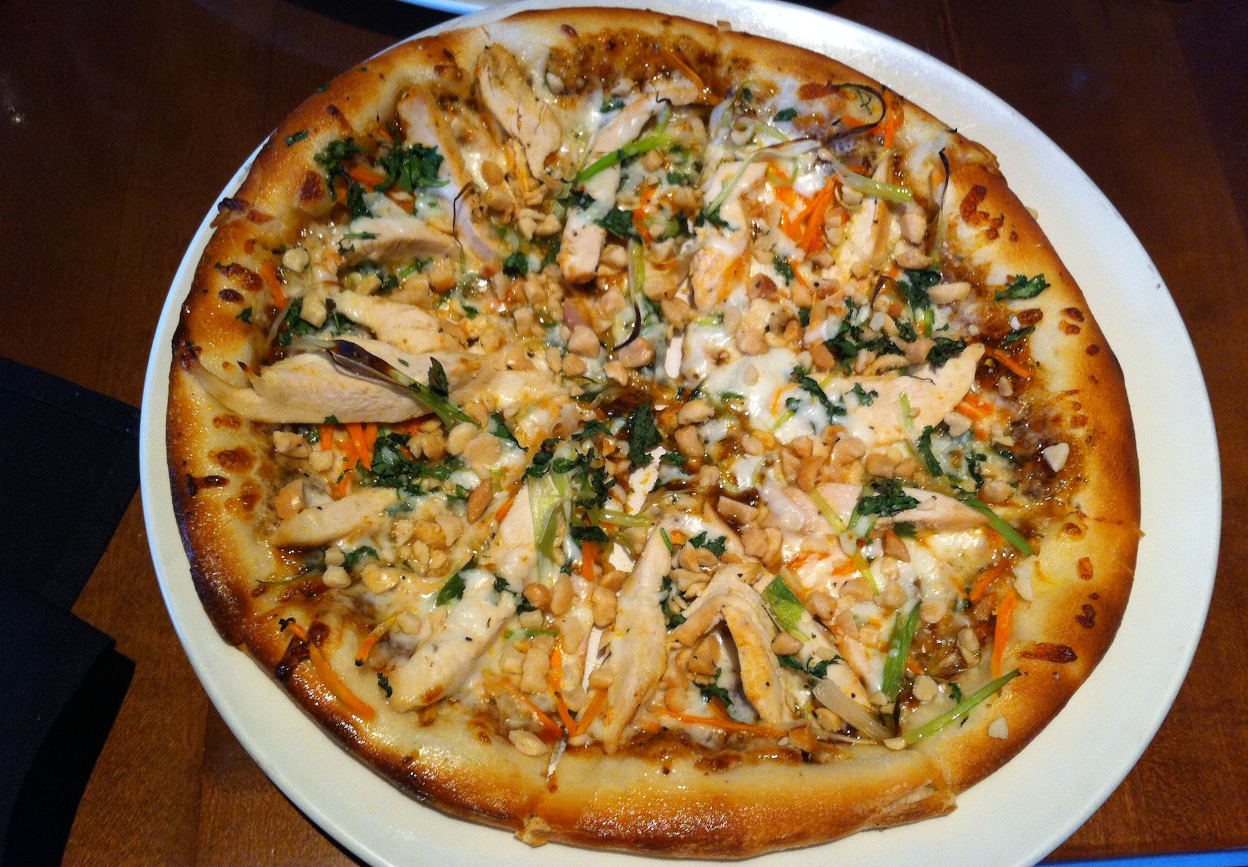 The pizzas were also half off during happy hour so each of us got a Pizza (probably not the best idea). Dustin got the barbecue chicken pizza and I got the Spicy Thai Chicken pizza. Mine had chicken, firecracker sauce, mozzarella cheese, macadamia nuts, carrots, green onion and cilantro