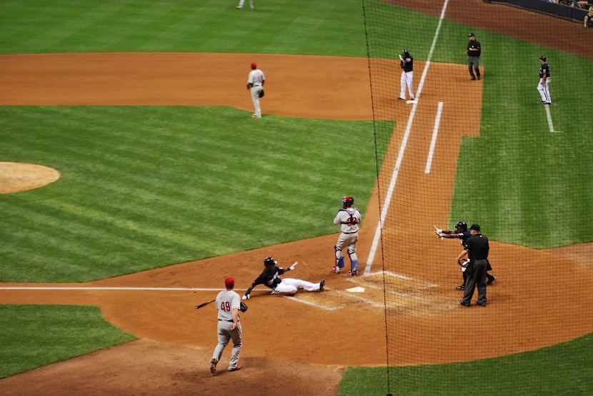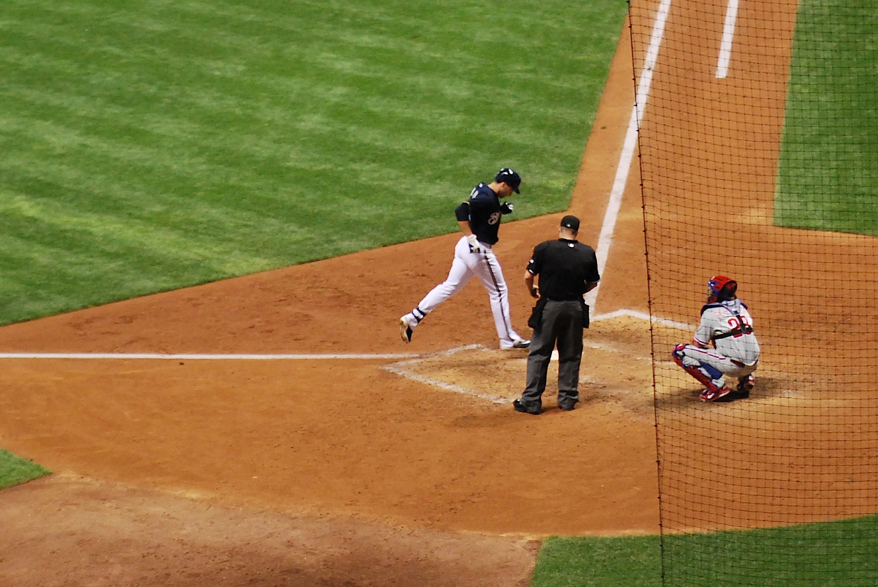 The Phillies elected to intentionally walk Jean Segura to get to Gallardo. I missed the 2-0 pitch of the intentional walk because I was talking to the woman behind us. This has happened four or five times now, and you’d think I would learn. Segura stole second with Gallardo at the plate and Yovani took advantage, singling to right and driving in both men on base. Segura must’ve wanted to practice his sliding because Nyjer Morgan is clearly giving him the stand up sign.