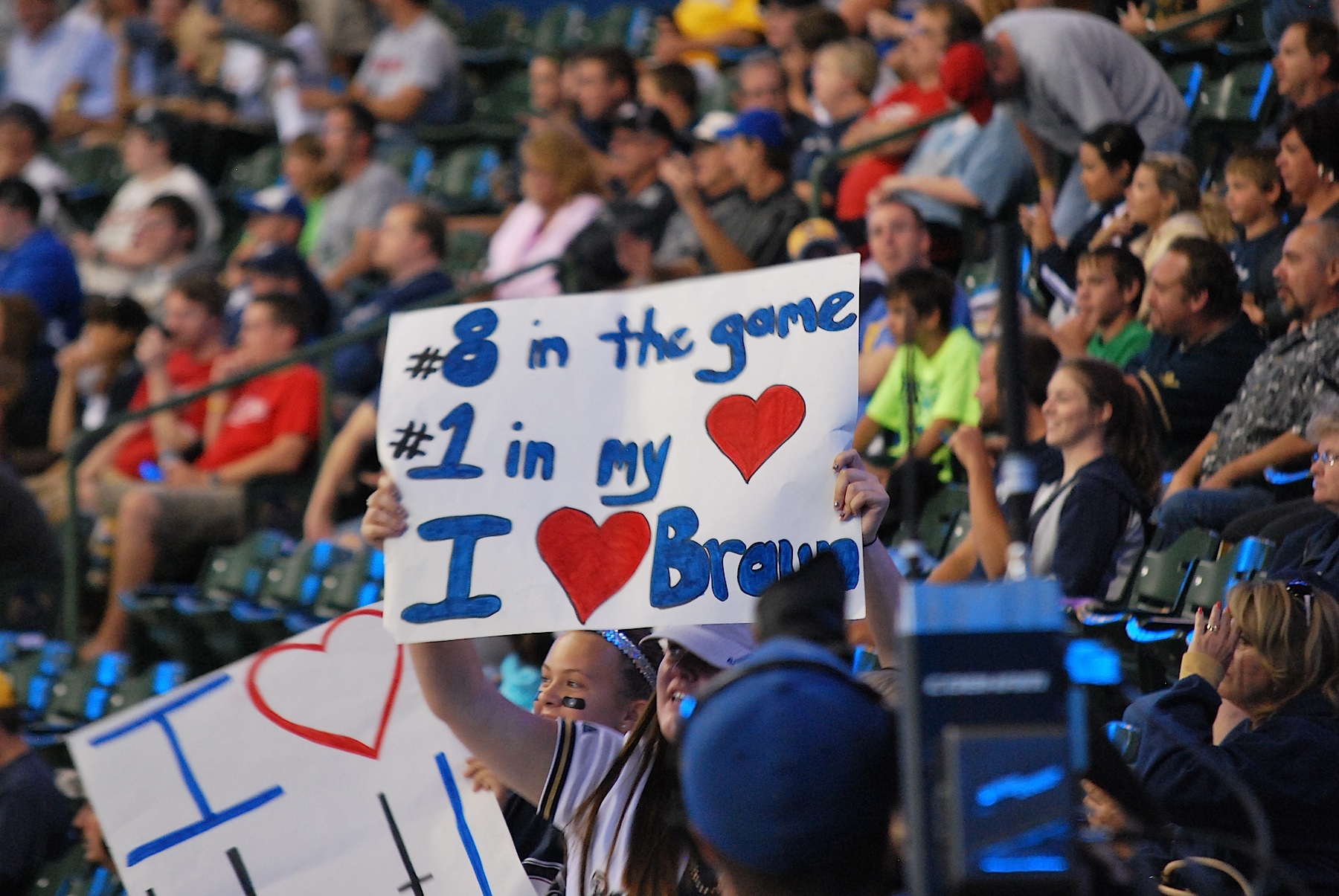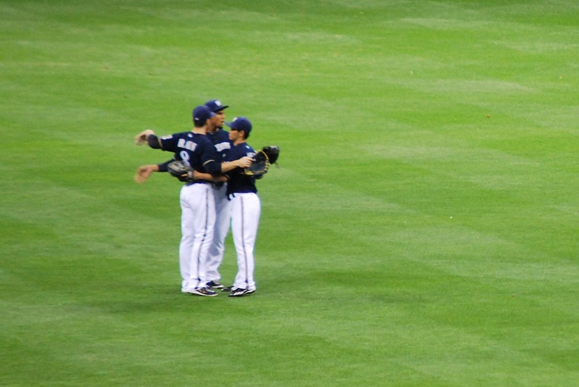 Livan Hernandez pitched the 9th and he made things a little interesting. Since I witnessed all three terrible losses to the Phillies in person back in July, I was a little nervous that the Brewers were sitting on six runs. They lost each game in that series by a final score of 7-6. And then I had 320 miles of Interstate 76 and I-76 signs to remind me of the sweep. With two outs the Phillies doubled and singled to cut the deficit to four runs. Hernandez got Brian Schneider to fly out to Gomez, and the Brewers hung on. Final Score: Brewers 6 – Phillies 2. It was group hug time for Braun, Gomez and Aoki after the win.