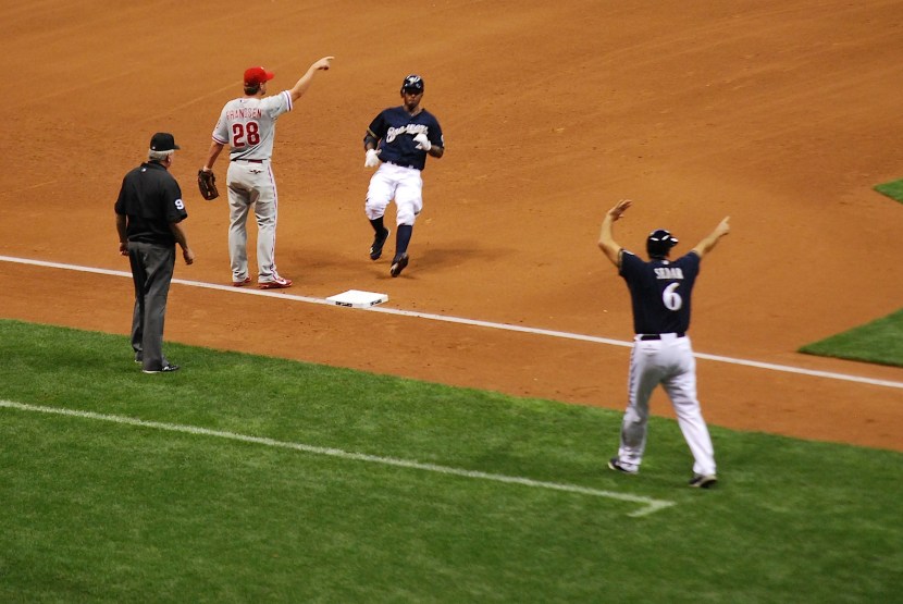 The game was going by pretty quickly and there were only three hits between the two teams going into the top of the 4th inning. Back-to-back doubles from Utley and Howard gave the Phillies a 1-0 lead. In the bottom half Vance Worley retired Braun and Ramirez in succession but the Brewers rallied with two outs. Hart followed Ramirez with a single and Maldonado walked. Nyjer Morgan was up next and he hit one to right center that glanced off Domonic Brown’s glove (I thought it should’ve been an error). The scorekeeper ruled it a triple and Nyjer Morgan pulled into 3rd after giving the Brewers a 2-1 lead:
