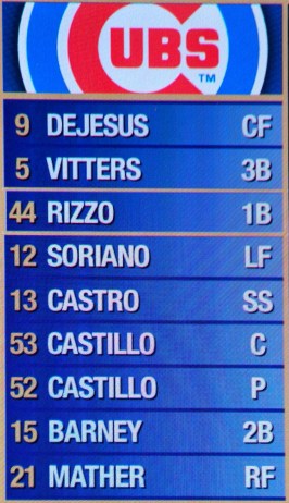 In the bottom of the 6th the Cubs brought in Lendy Castillo and the Cubs lineup looked like this. The classic Castillo-Castillo battery, and they sported consecutive jersey numbers, awwww…..