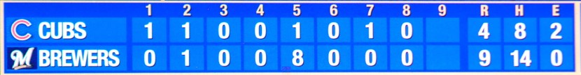 In the 7th the Cubs got a solo run on an RBI-groundout and in the 9th a wild pitch by Livan Hernandez allowed another run to score. The 8-run inning proved the difference and the Brewers won going away. Final Score: Brewers 9 – Cubs 5. I took this picture before the wild pitch and the 5th run for the Cubs, but you get the picture. That snowman in the 5th sure looks nice. I believe it’s the most runs the Brewers have put up in a single inning this year. Since I’ve been to every game you’d think I would know that, but I’ve witnessed a lot of baseball and games start running together and details get forgotten.