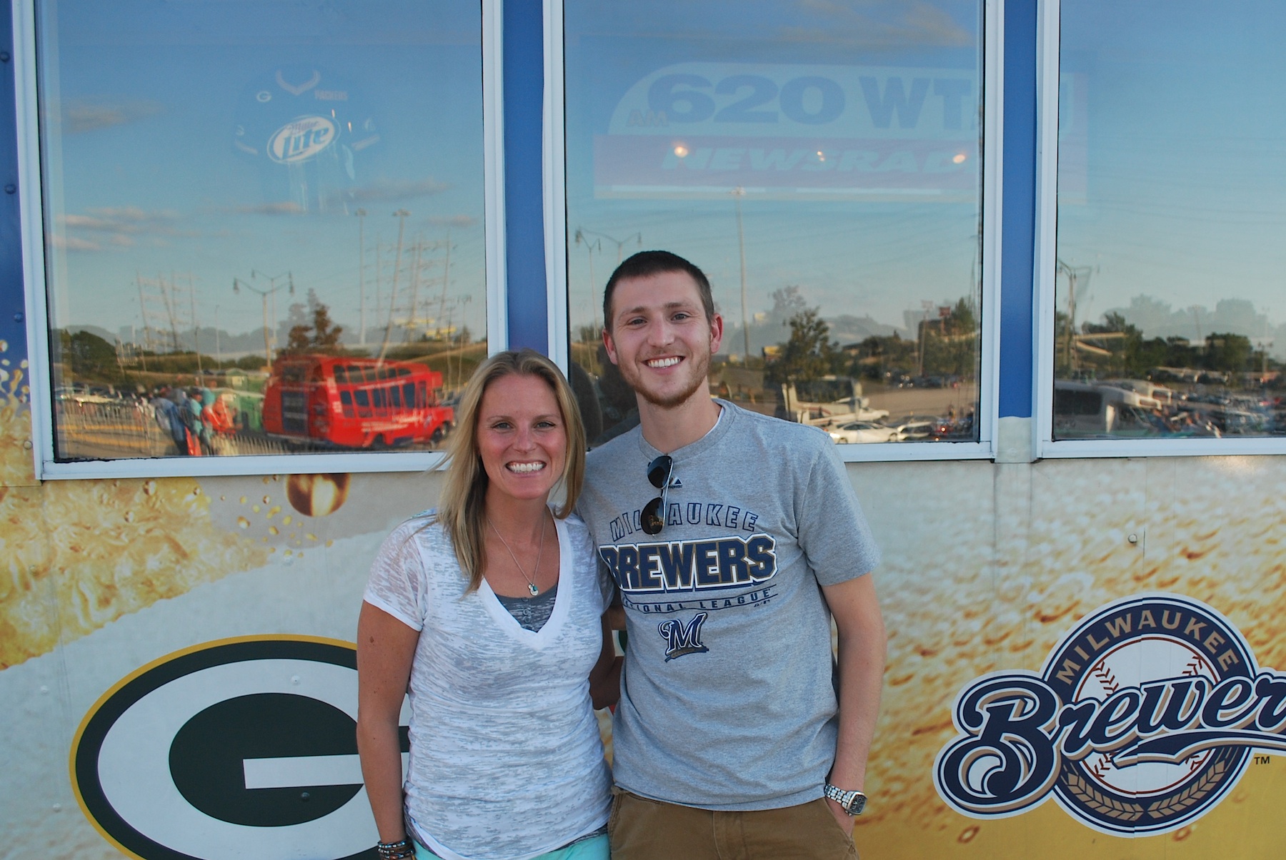 At 5:55 I headed to the 620 WTMJ tailgater that’s located near the home plate entrance. Trenni Kusnierek had invited me on the show, and I joined her and Greg Matzek on air around 6:20. They asked questions and I answered them, talking about my journey thus far as well as Be The Match. Before parting ways Greg took a picture of Trenni and me.