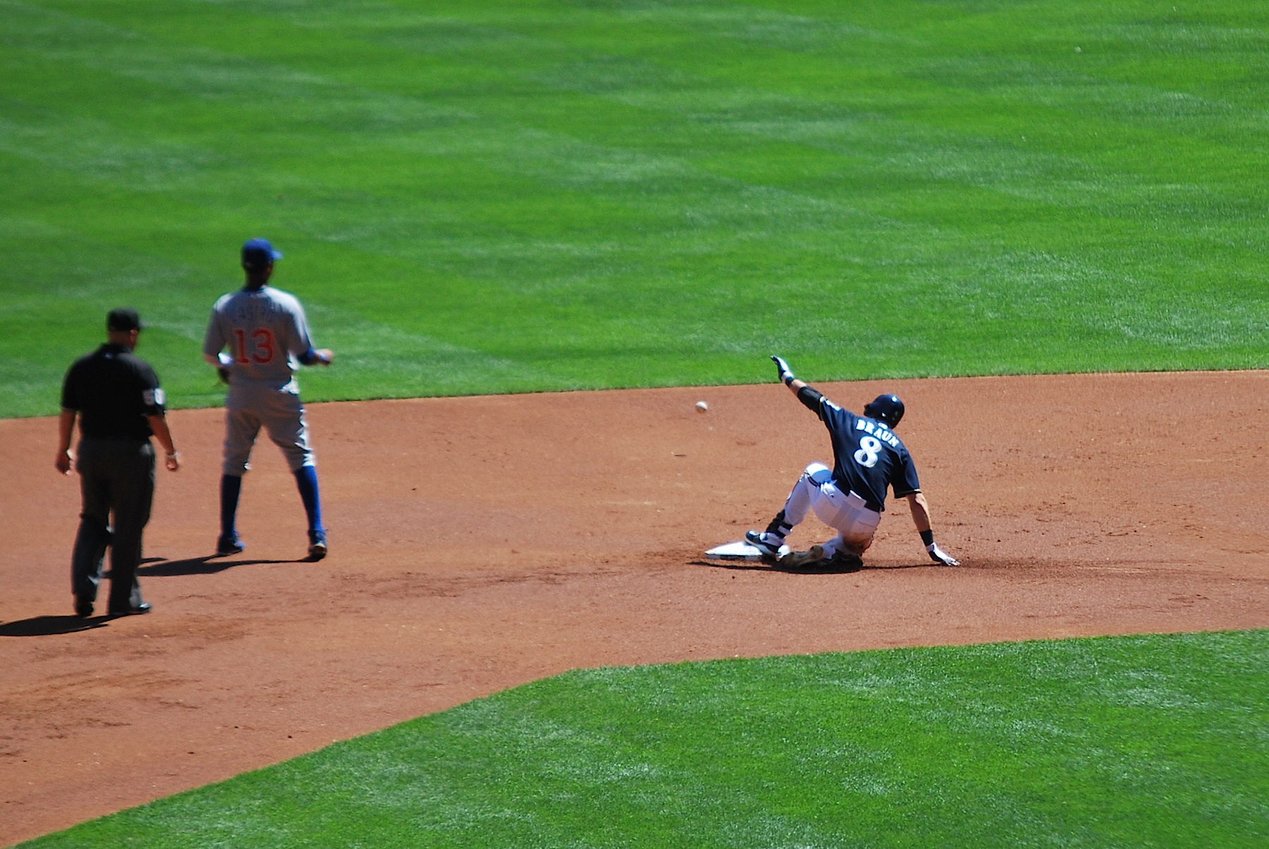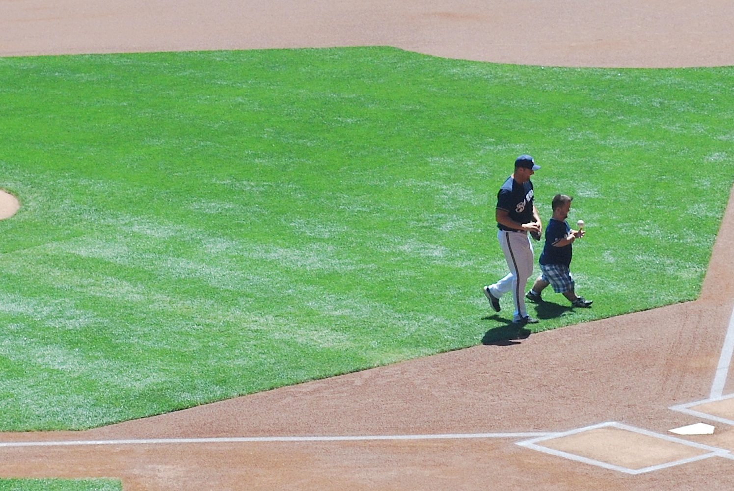 In the bottom of the 5th inning Aoki fouled a pitch back that was heading almost right towards me. I had my glove on, stepped into the aisle and reached forward a bit to make the catch. The guy across the aisle from me thought he would try and catch it as well, bumping my glove in the process. Instead of the ball smacking the webbing of my glove it hit the heel. Bouncing down the steps it went where it was picked up by another fan. If I would have been a spectator of the event I would have given me a hard time. I may have booed because if you bring a glove to a game you HAVE to make the catch, otherwise you’re subject to ridicule. I probably still should have made the catch despite the contact from the other fan, so I will take full responsibility for the error. If I hadn’t already caught two foul balls this year I would be a little upset, but I have, so I’m over Wednesday’s shortcomings.