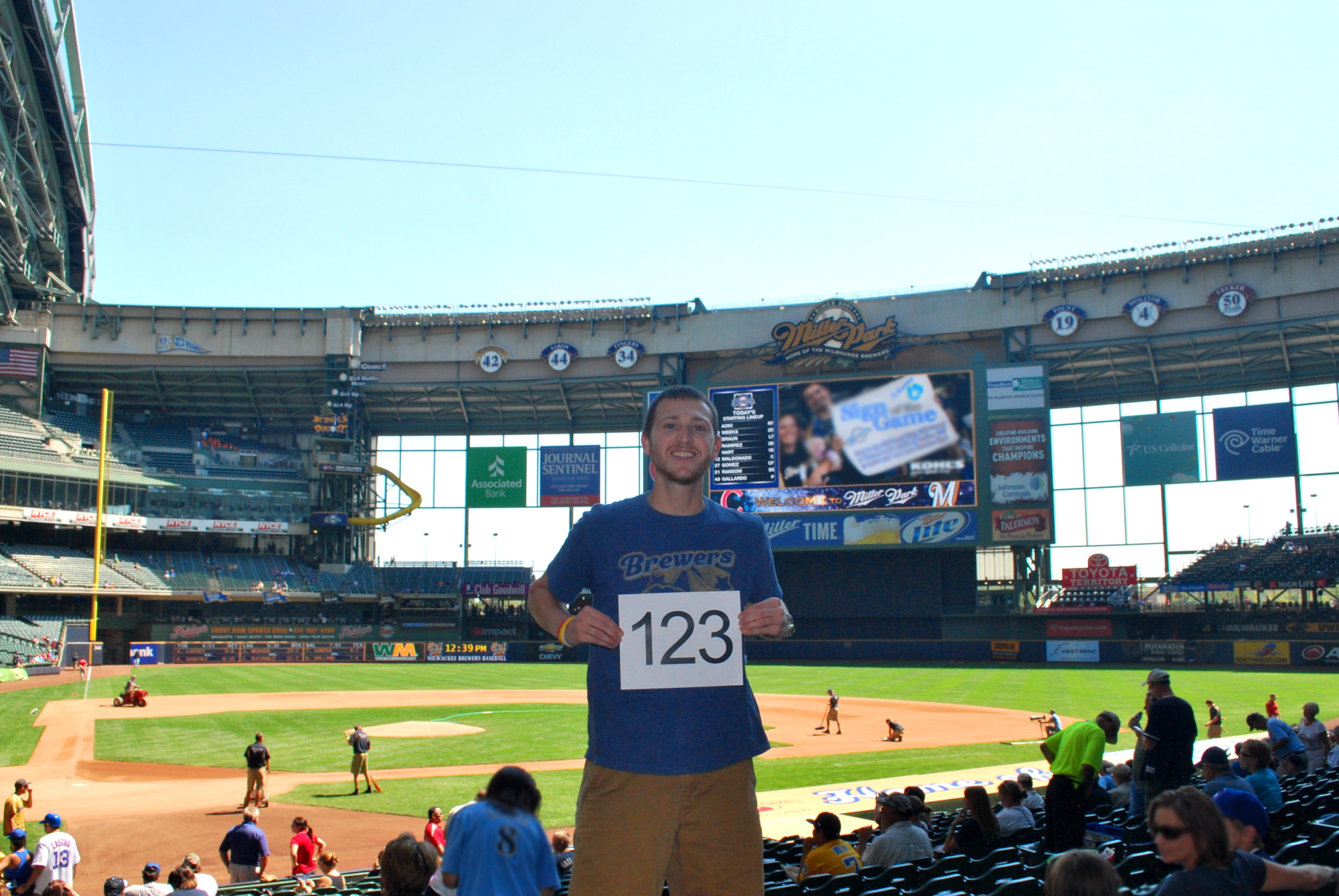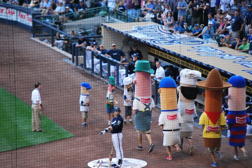 The middle of the sixth is when the sausage race takes place, and for some reason they did a relay race on a Wednesday. I thought they only had the little weenies race on Sundays. I like that Braun is just minding his own business, getting ready for his at bat.