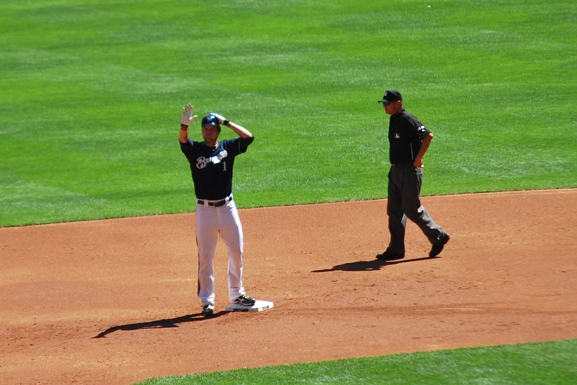 After a Ramirez pop-out Corey Hart hit the third double of the inning for the Brewers, driving in Braun and giving the Brewers a 2-1 lead. Here’s Hart at second giving a long distance high five to Ed Sedar.