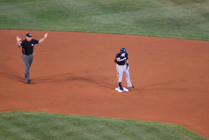 Aoki doubled on the 2-2 pitch and did his finger-mustache thing once he was safely at second. It looks like the umpire is saying: “Now wait just a minute! What does that mean!?!?” (Aoki had called time, thus the hands in the air)