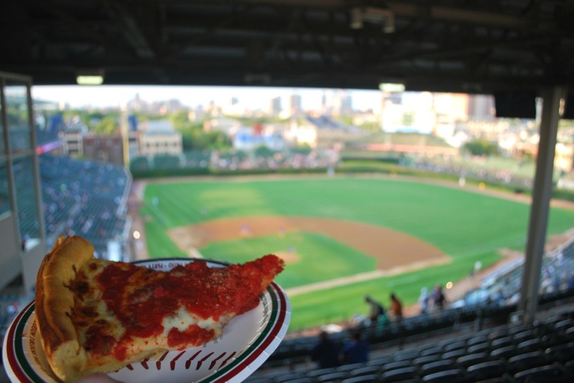The deep dish pizza looked good so we each got a slice of sausage pizza and an Old Style. We went to our seats and ate while waiting for the game to start. The pizza was very good, and I can’t remember the last time I had deep dish pizza (before Wednesday).