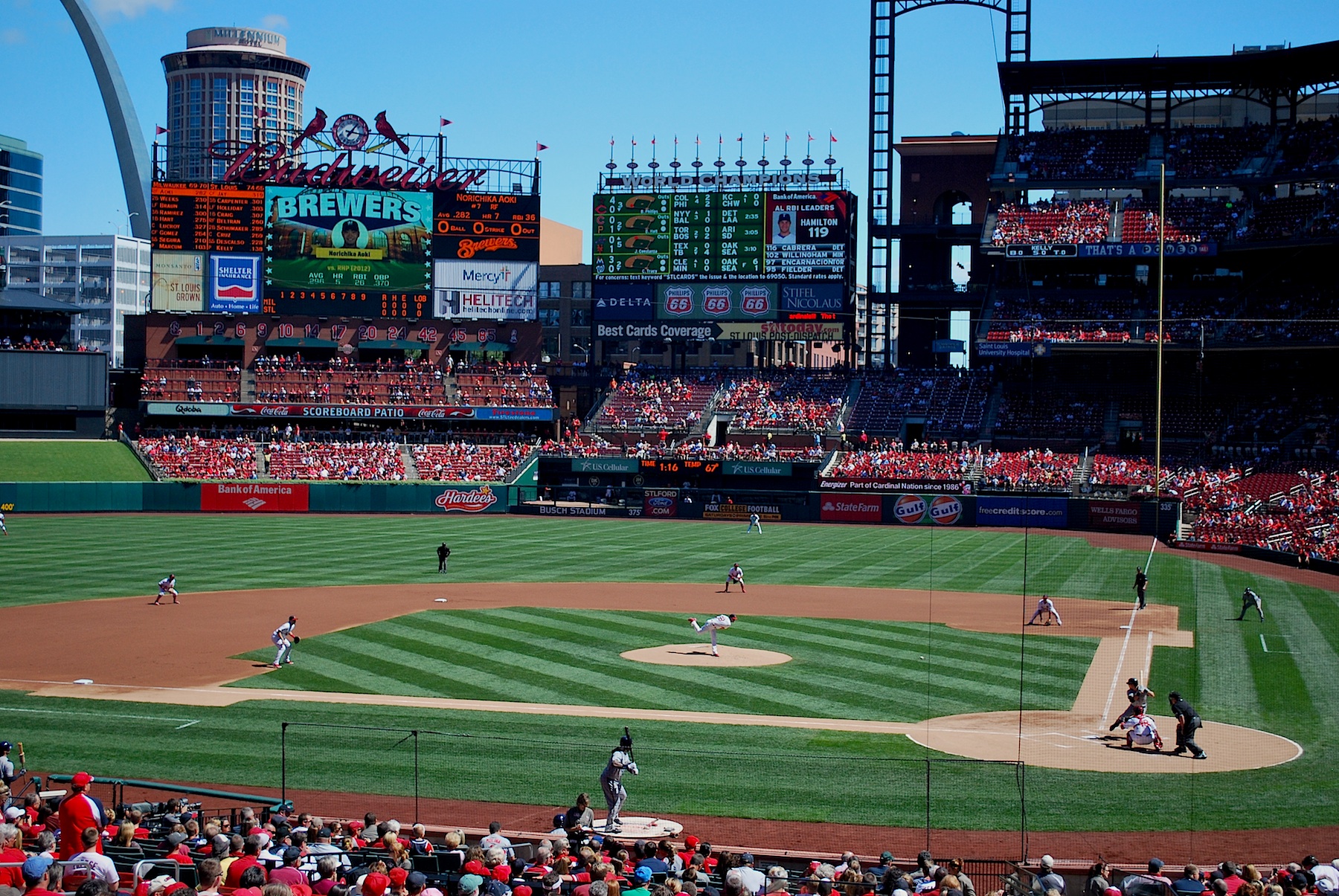 With one out Segura doubled off the Cardinals’ closer, Jason Motte. With two outs Aoki stepped in and the count went to 2-2. Down to his (and the Brewers’) last strike Aoki hit the 99 MPH pitch from Motte over the wall in right for a game-tying 2-run home run. It either bounced on the top of the wall and over or hit the railing beyond the wall, but it was close. It was a line drive so I wasn’t sure if it was going to “get up, get up, get out of here” or not.