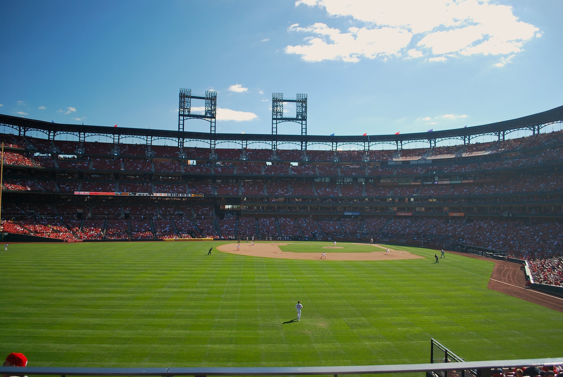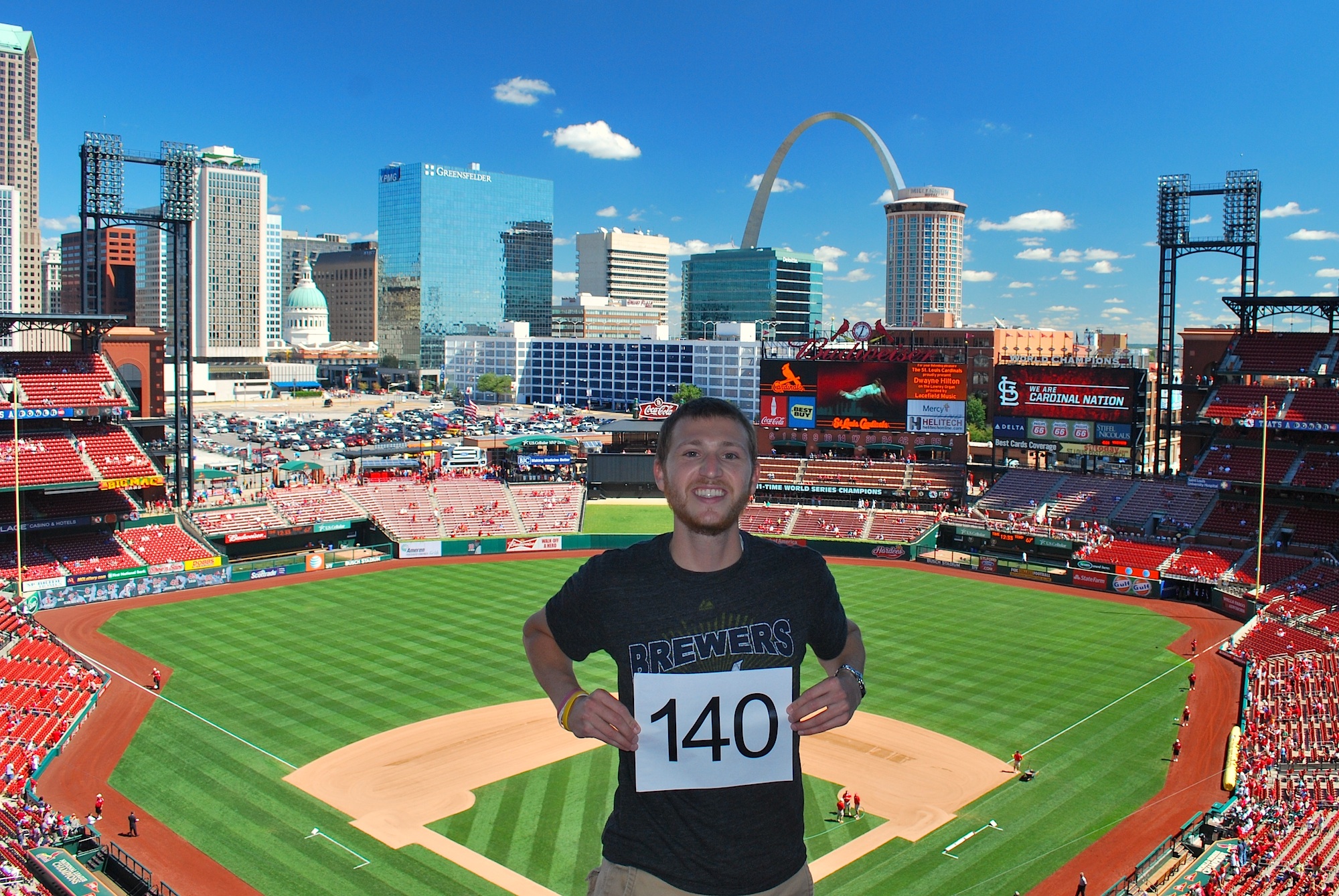 After eating breakfast I started getting everything packed for the trip home. I put my suitcase in my car and then walked to Busch Stadium. I picked up my ticket from will call at noon and was inside two minutes later. I debated where I should get the game number picture taken. I normally try to get a picture taken from the outfield seats looking in towards home plate but this is sometimes a boring picture. With the sky as blue as it was I decided on another picture from the upper deck behind home plate. I had already gotten this for game photo number 21 but as you can see the top half was all washed out due to the overcast skies.