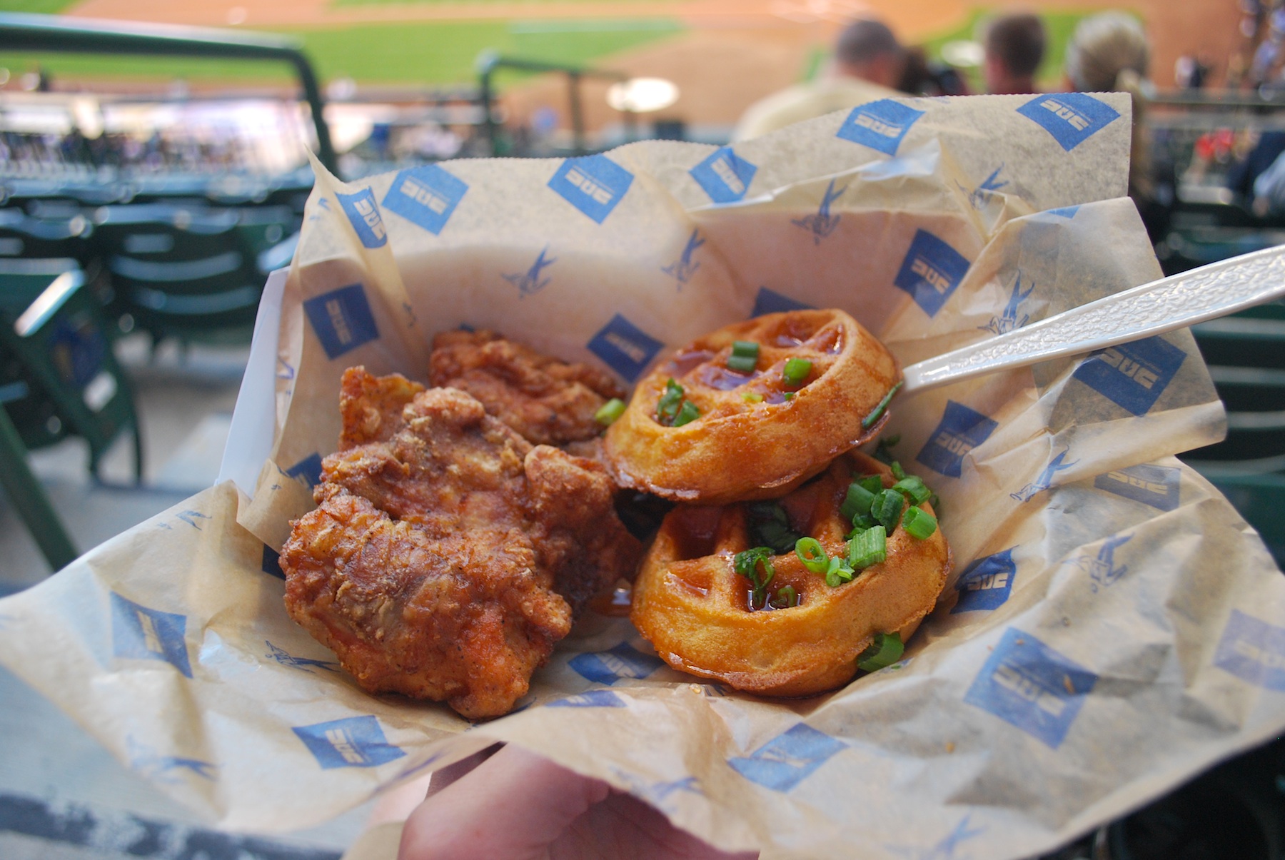 After getting the game number picture taken I went up to the loge level and got what the Chef’s Table had to offer. For the Braves series they have Atlanta’s Famous Chicken & Waffles. It probably doesn’t need a description but the menu read “Fried Chicken Drizzled With a Sriracha Honey Sauce Served Over Thyme Scented Waffles.” It was magtacular.