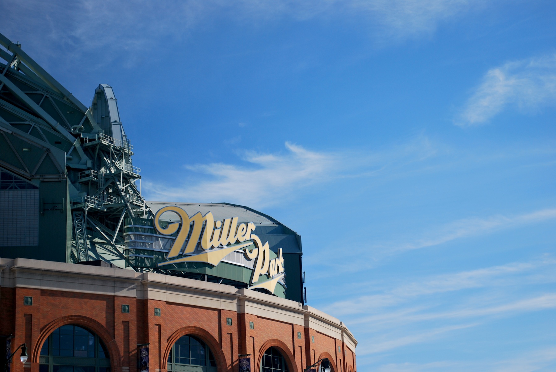 Monday was the first day of a six game home stand, and I was looking forward to heading back to Miller Park. I left my parents’ place at 3:20 and was parked 62 minutes later. I started walking to the will call windows to drop off my extra ticket for my twitter follower. While doing so the Miller Park sign caught my eye. I know I’ve taken a bunch of pictures of the home plate entrance but I thought the angle and sky were “pretty neat” on Monday.