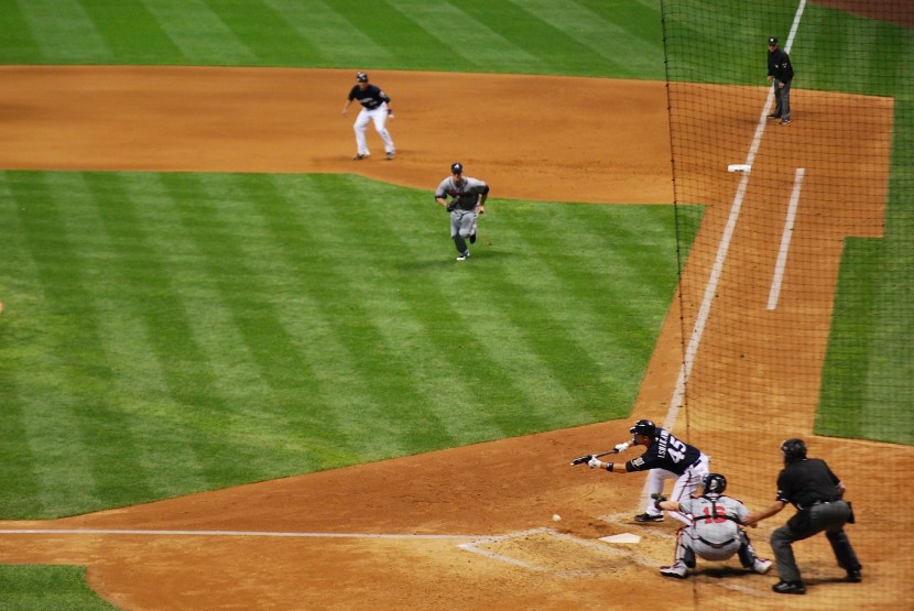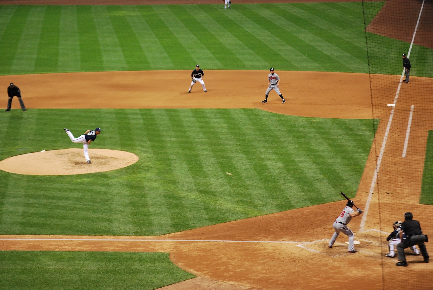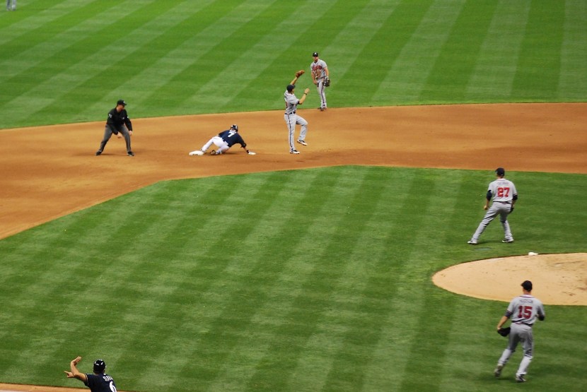 Gomez was then hit by a pitch to load the bases with only one out. Segura grounded one to second baseman Dan Uggla and the Braves attempted to turn an inning-ending 4-6-3 double play. Gomez executed a nice takeout slide and with Segura’s speed he was *just* able to beat the relay throw to first. I thought he was out mainly because of how the first baseman reacted. The first baseman is probably the only guy (on the field) who knows for sure because he can feel the ball hit his glove and feel the baserunner step on the bag. People on twitter informed me that he was in fact safe and the umpire made the right call (nice job Lance Barksdale). Ramirez scored from 3rd on the play.
