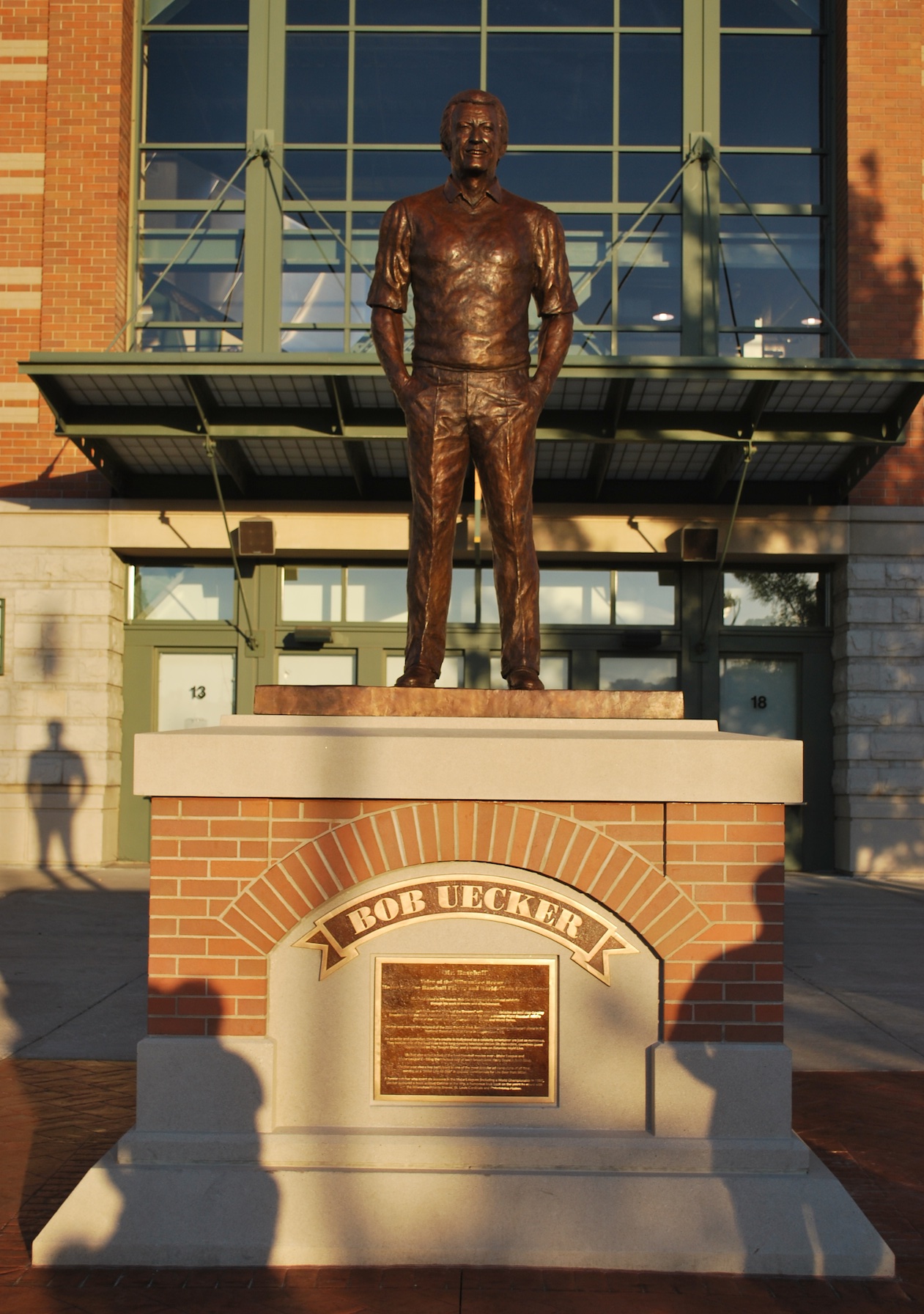 Back to reality: I got my camera from my car and walked over to the Bob Uecker statue to take a look. I like the long shadow that projects the statue’s outline on the exterior wall of Miller Park on the left there.
