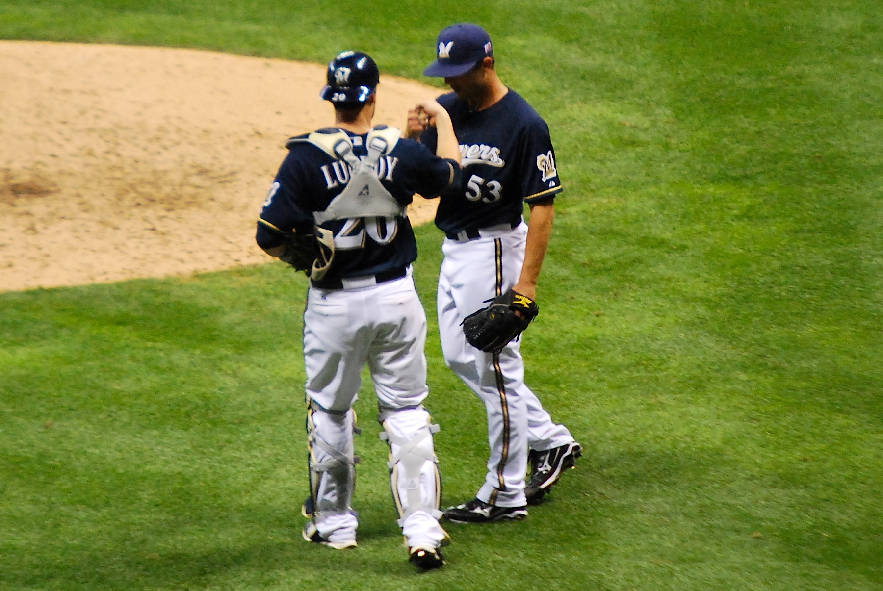 Brewers win! Brewers win! That will never get old. Final Score: Brewers 5 – Braves 0. Lucroy gave Kintzler knuckles for a job well done.