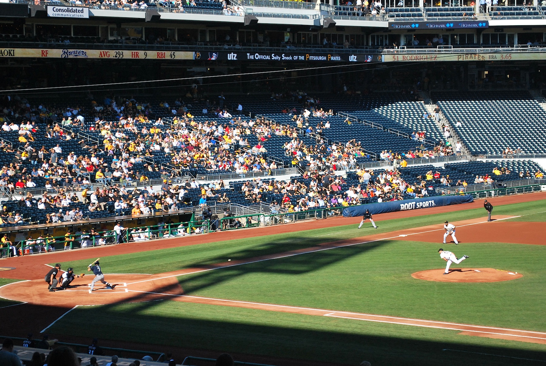I left at 2:20 and parked at the same garage on Sixth street that I did for the previous five games in Pittsburgh. Since it was an afternoon game (and still within business hours) parking was $9.75 as opposed to the event rate of $5, darn. I got my ticket from will call and was inside the park by 3:05. The Pirates have some statues inside the left field entrance but this one stands out. It’s a casting of Ralph Kiner’s hands. Kiner played for the Pirates from 1946 to 1953, made the NL All-Star team six times in those eight years and won the home run title seven times. His number 4 is retired by the Pirates.