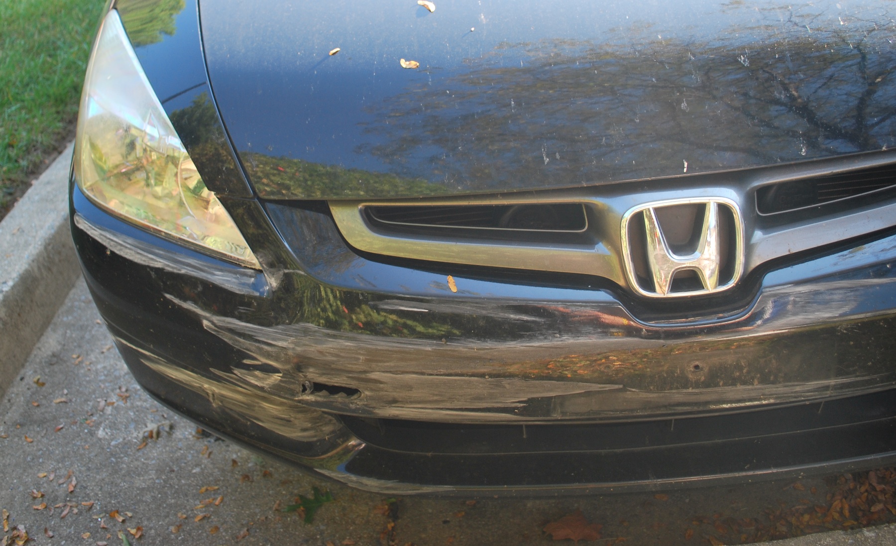 The lady on the line transferred me once she learned no one was injured or in danger. As I talked to the new lady on the phone I inspected the damage, expecting to see a hanging bumper or a bent quarter panel restricting the movement of a front wheel. Luckily it wasn’t too bad but my front license plate and holder were completely torn off. I thought about going back to find it. The road was narrow, it was dark, and I didn’t feel like risking my life (without a flashlight, thanks batteries) to possibly get my license plate back. I called Victoria and then my mom to tell them I was fine (I don’t think they would’ve liked to learn about what happened by reading it).