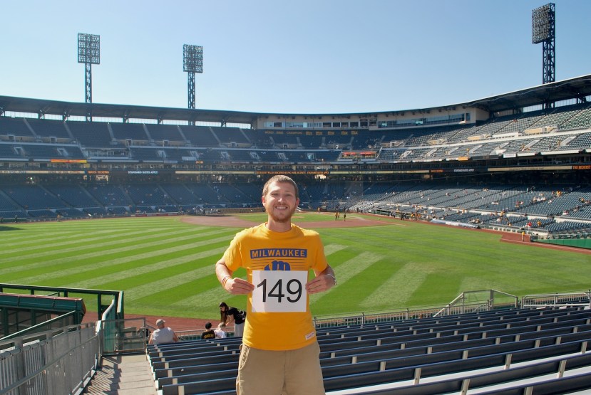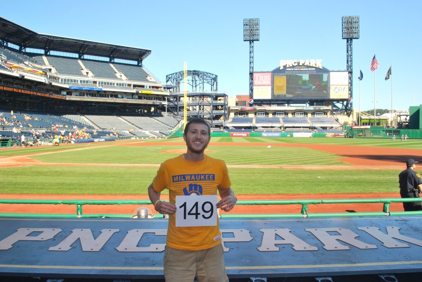 I went to the upper bleachers in left field for game photo number 149 and a very nice woman took the picture for me. I also had one taken from above the visitor’s dugout and I think I like it better. While the one from the outfield provides a different angle than the previous 5 at PNC, it’s kind of boring. I like that PNC Park is readable in the second one.