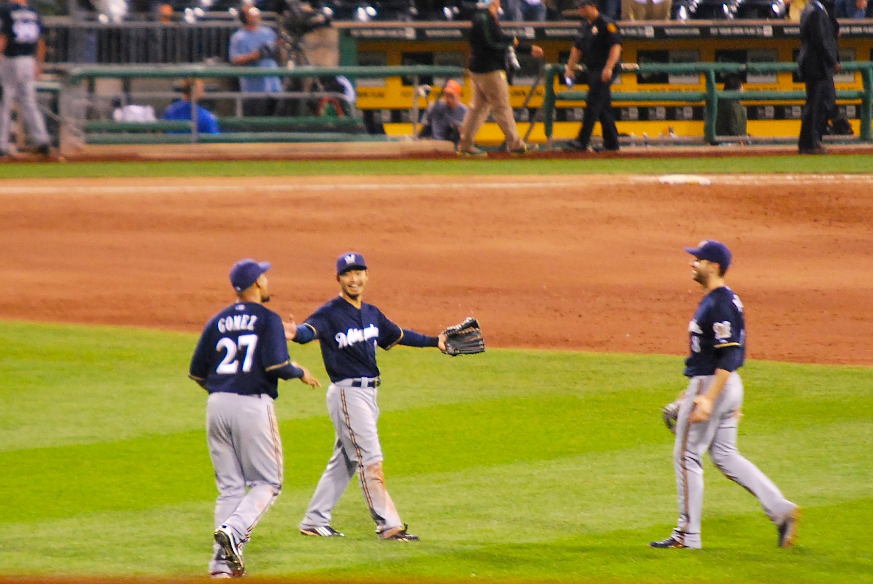 The Brewers added an insurance run in the top of the 9th and Axford shut the door; striking out the side in the bottom of the 9th. Sweeeeeeeeeep!!! It’s a little blurry but you can see that Gomez, Aoki and Braun were all smiles after the game.