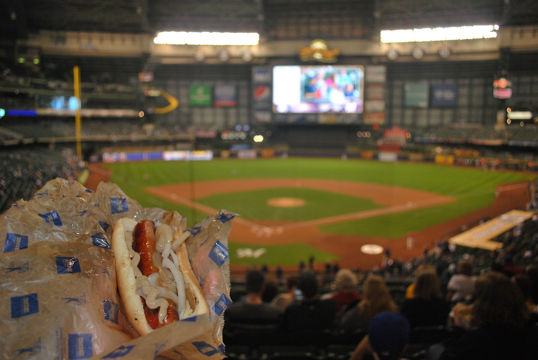 I got my 100th sausage of the season from the concession stand across from section 213. After saying hi to Bill (the extremely) friendly usher by section 216 I stopped in front of the press box to take the picture of the “century sausage.”