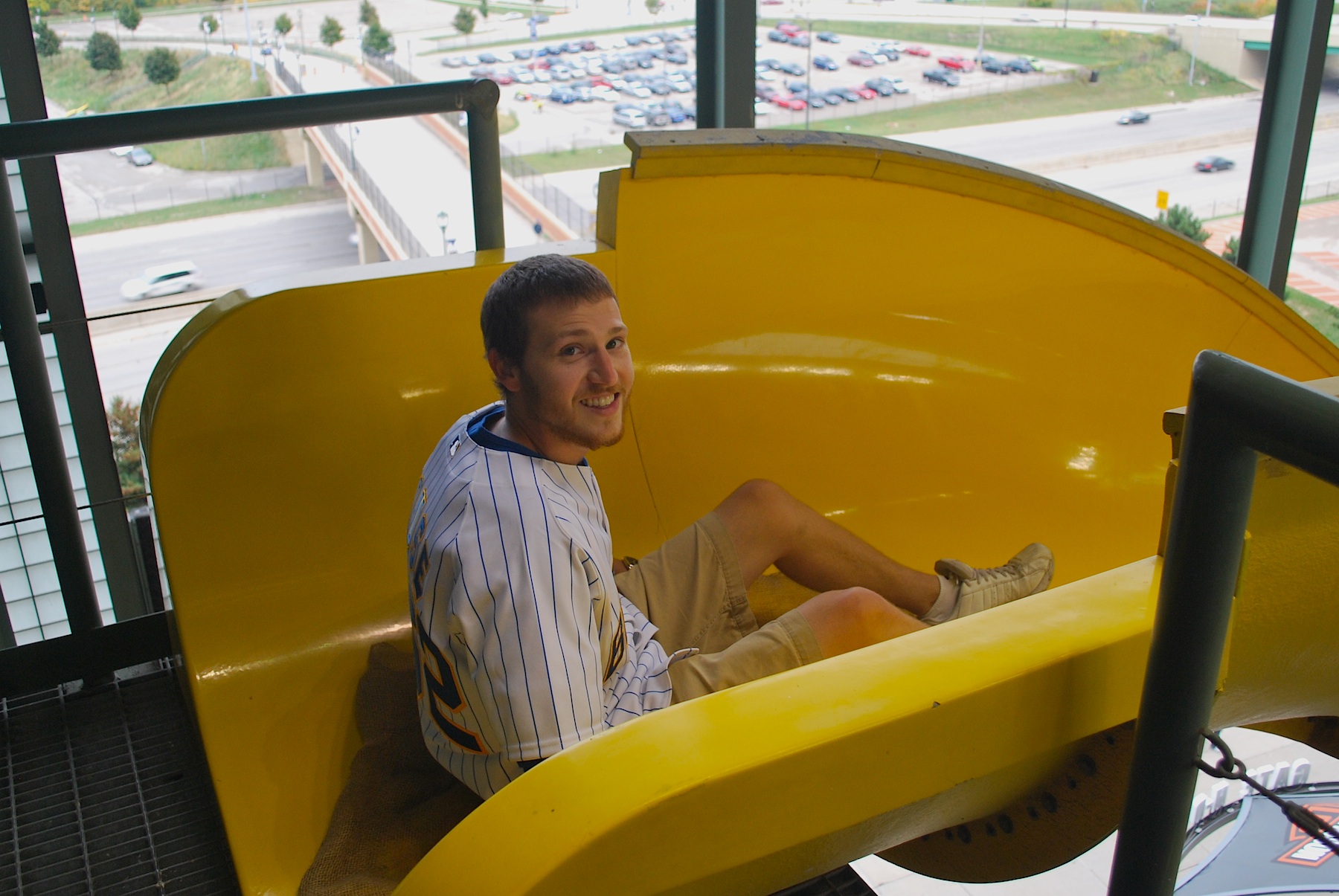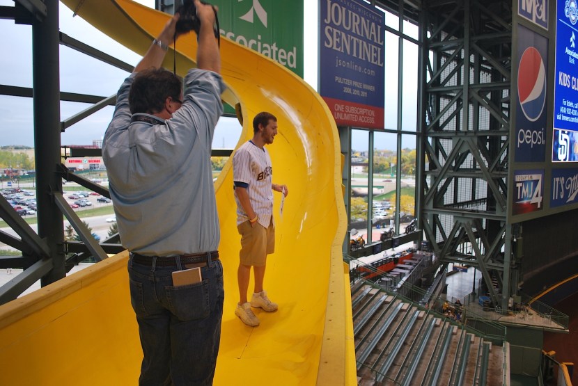 I went down the slide again and then called it quits. We could’ve gone down more times if we had liked, but I felt bad with everyone just bumming around while I had all the fun. During this whole time Bill was asking questions and Mark was taking pictures. I’m not sure when the story will run in the paper but it’ll be sometime soon I’m sure. Frank led us down to the field level and Victoria and I went to Friday’s Front Row to have a beer. Thanks to the Brewers for allowing me to go down Bernie’s slide, which any fan can do now (not for free though). Thanks Brittany for meeting with us and Frank for showing us around.