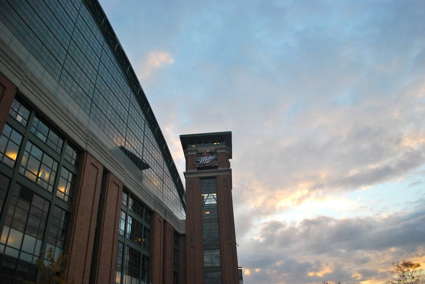 We hadn’t gotten our tickets scanned since we entered through the executive offices so Victoria and I exited the left field corner and walked towards the home plate entrance. The Miller clock tower and skies were ripe for a picture.