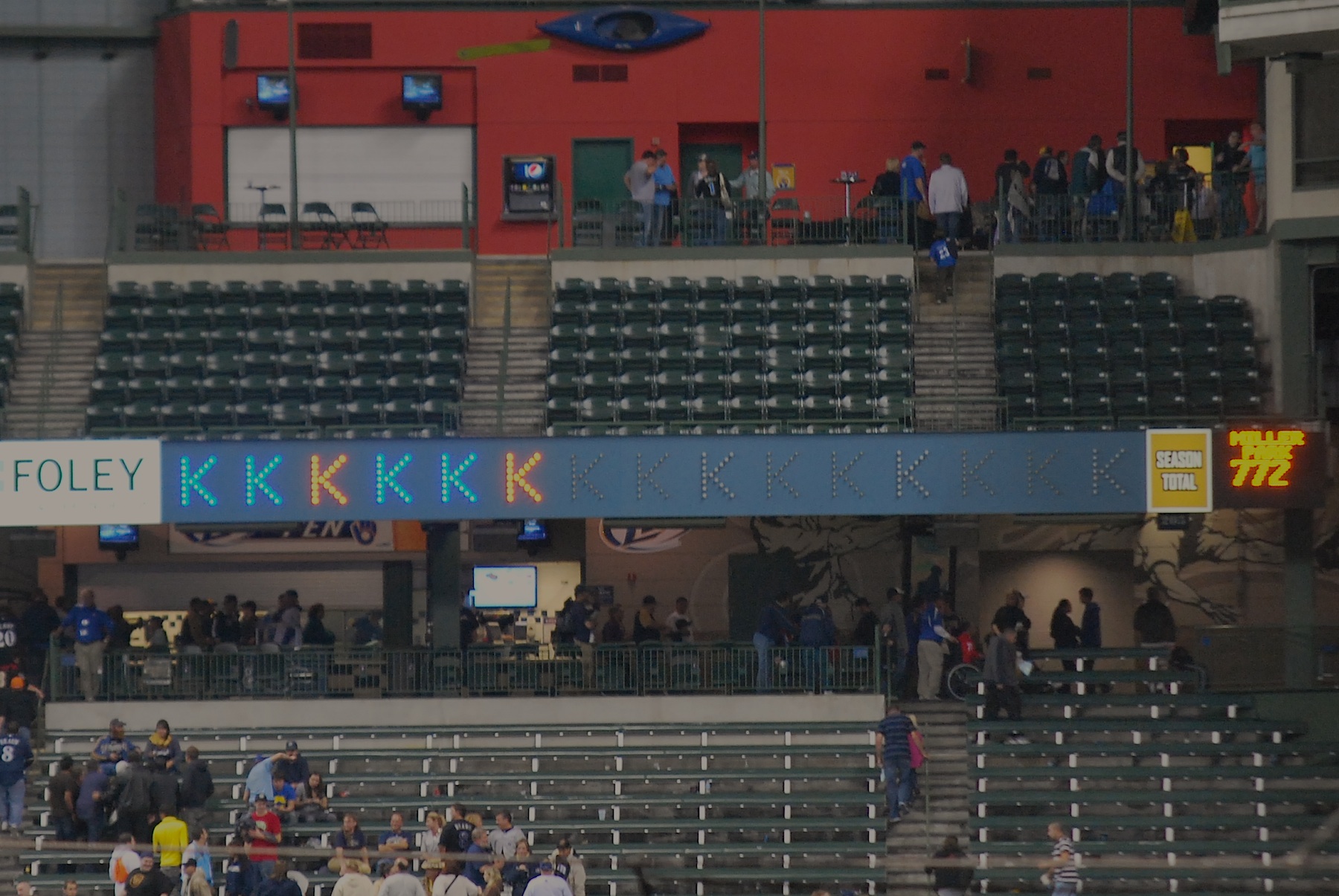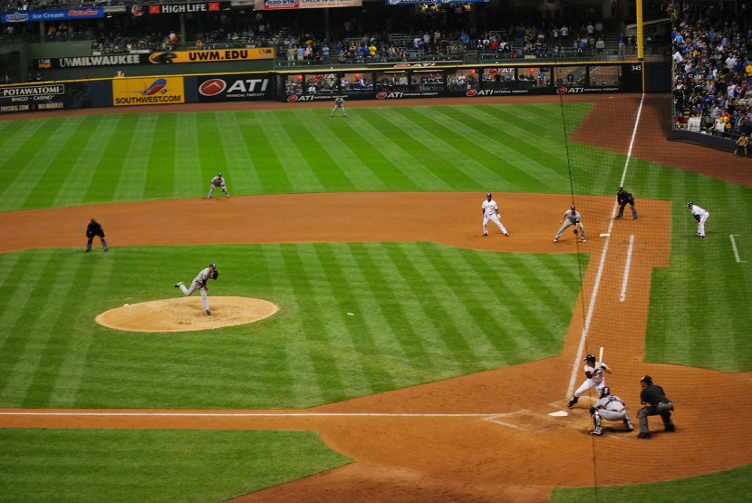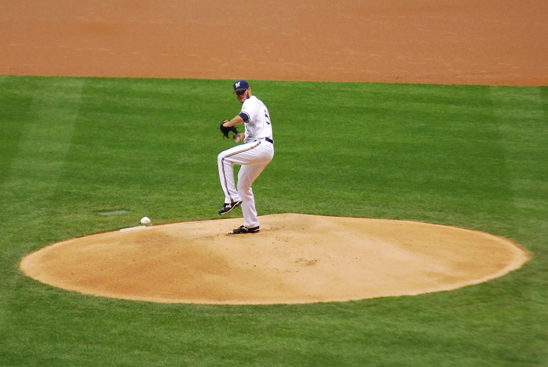 I was in my seat in time for the first pitch but wasn’t prepared to take the final first pitch picture. I don’t feel bad because I didn’t start doing it until later in the year, so it’s not like this is the first time it happened. Stinson started in place of Yovani Gallardo, which greatly decreased the likelihood of seeing the necessary nine strikeouts to set the MLB team record for Ks. Here is Stinson pitching in the 1st inning.