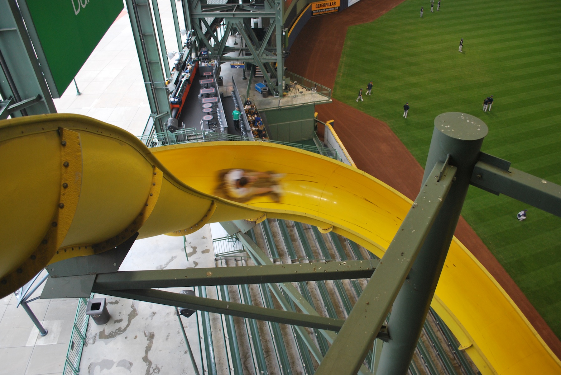The Padres were taking batting practice and while I was sitting in the slide someone on the team, I’m assuming Cameron Maybin or Carlos Quintin, hit a home run off the slide not too far from where I was. It didn’t hit the inside of the slide but nonetheless, it was a little startling. Victoria informed me that she had been standing on the edge of the slide to take my picture and when the ball hit the slide it made a loud noise and she stepped off, thinking it may be collapsing. Not cool. I stood up and yelled to whoever would listen; “HEY! I’M IN HERE!!!”