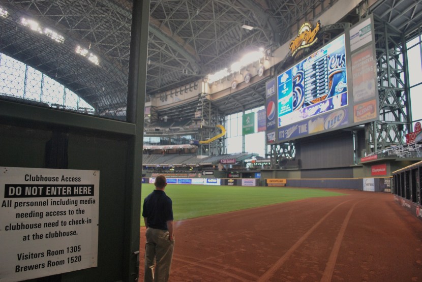 In the right field corner are the executive offices and we met with Brittany from Marketing and Frank from Brewers Enterprises. Also along for the trek up to Bernie’s dugout was Bill Glauber and his photographer, Mark Hoffman. Frank took us down to the service level where we walked past Bob Uecker’s SUV, the only person allowed to park in the stadium. We briefly went out on the field and if you’ve been following along since day one this picture will look very similar to the one I took on opening day.