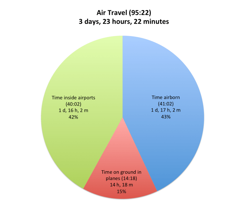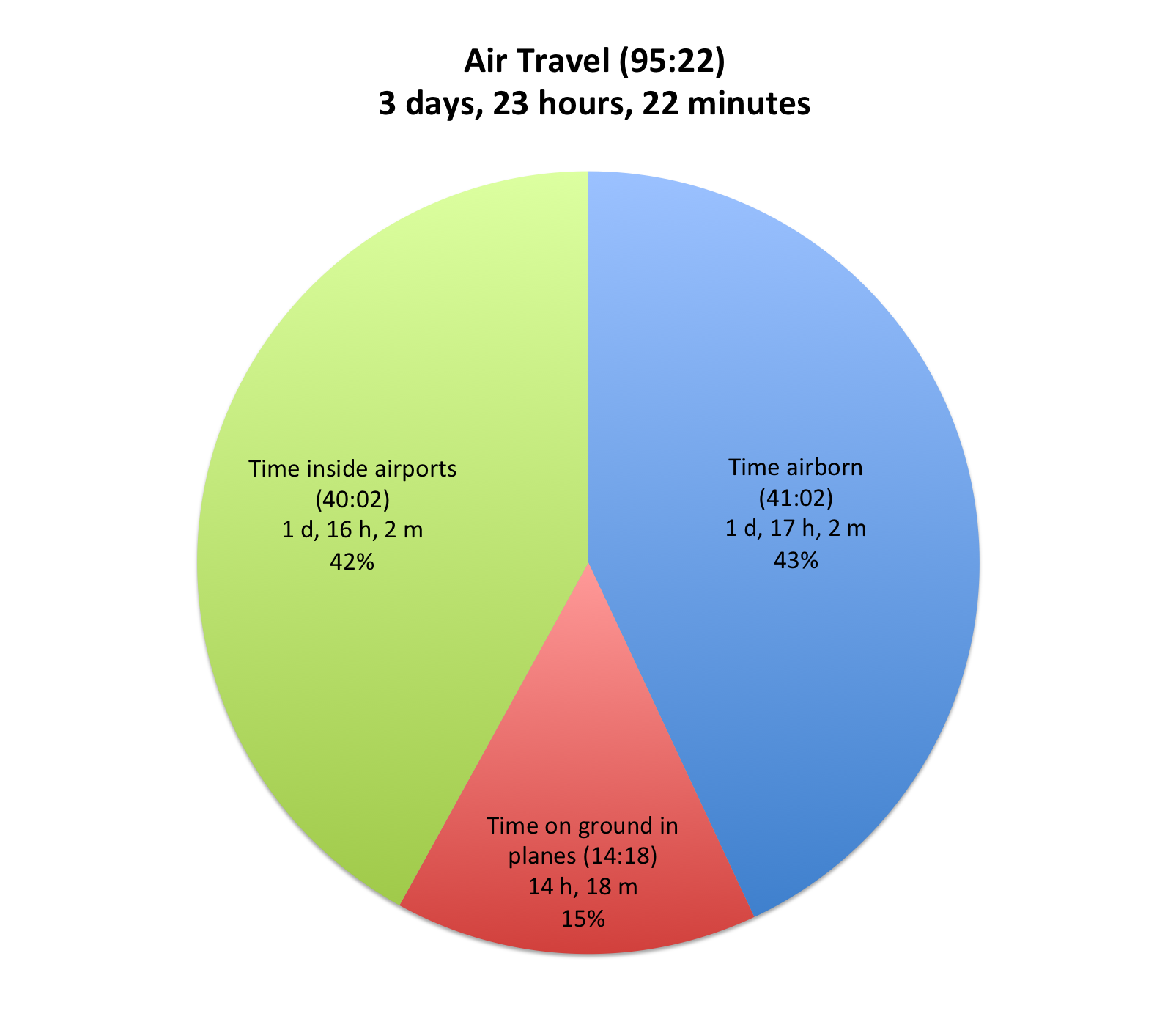 In kind I kept track of time spent on air travel. I broke it down into three categories, and it’s a little alarming how much time was spent just sitting on the ground in airplanes (and I didn’t experience a single tarmac delay).