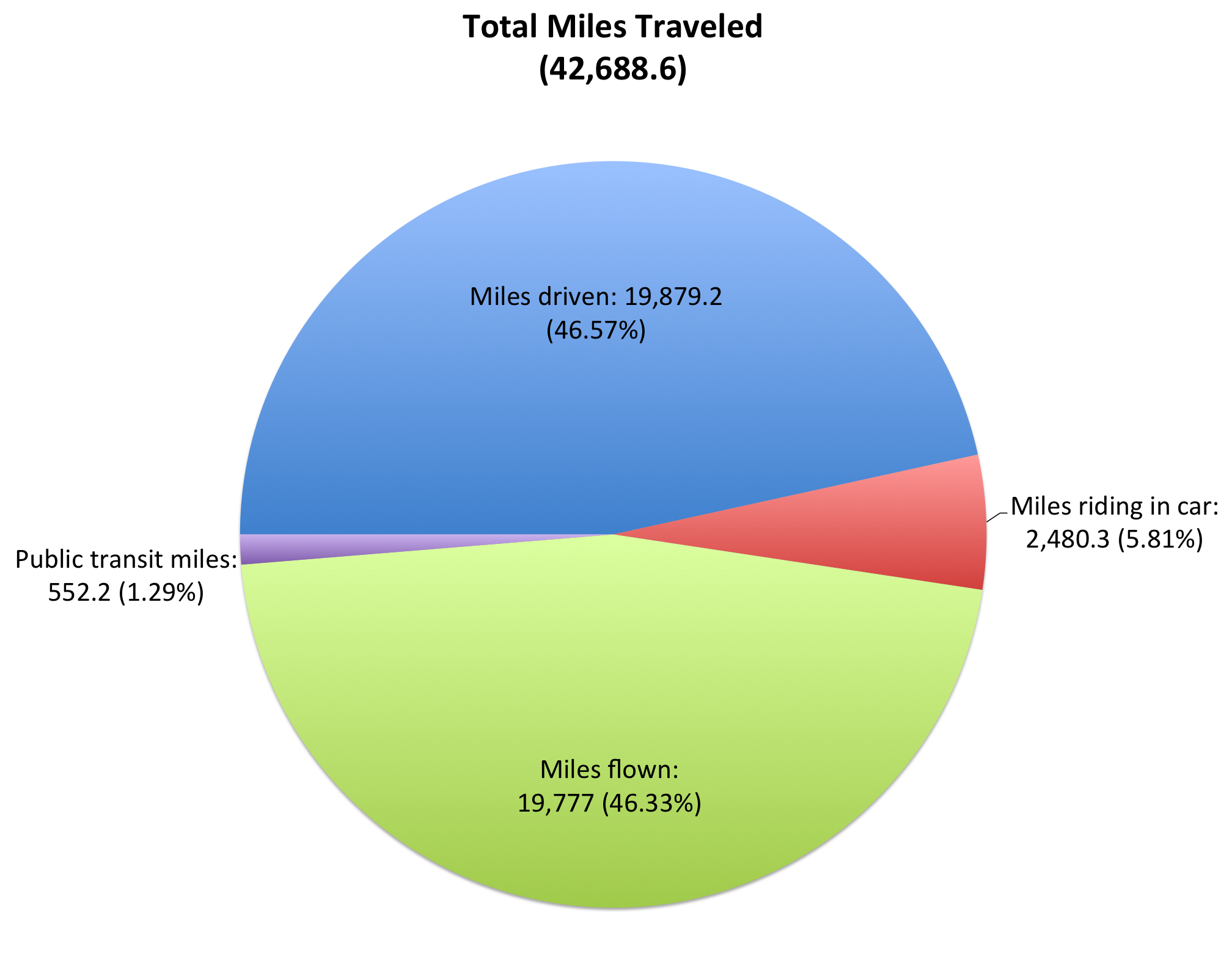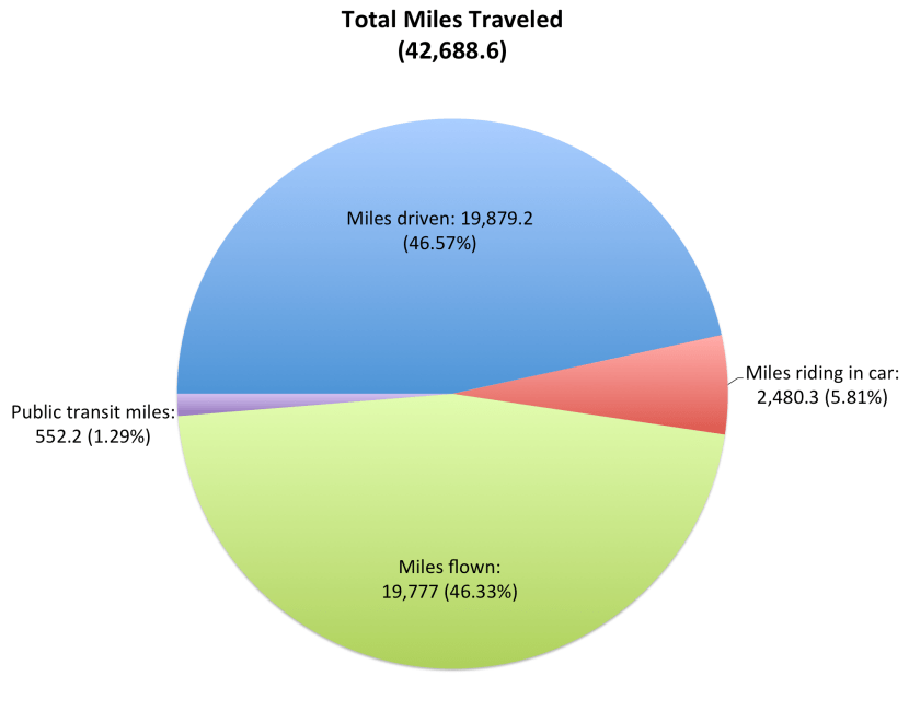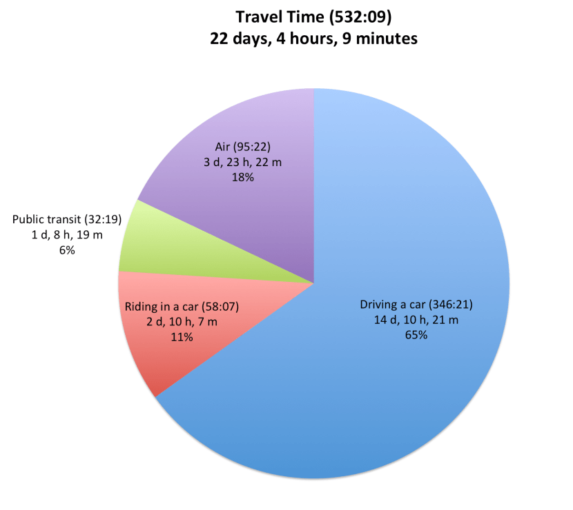 I also kept track of time spent traveling. And yes, it was just as tedious as it sounds. Every time I got in my car or stepped in an airport I was keeping track in my notes app on my phone.
