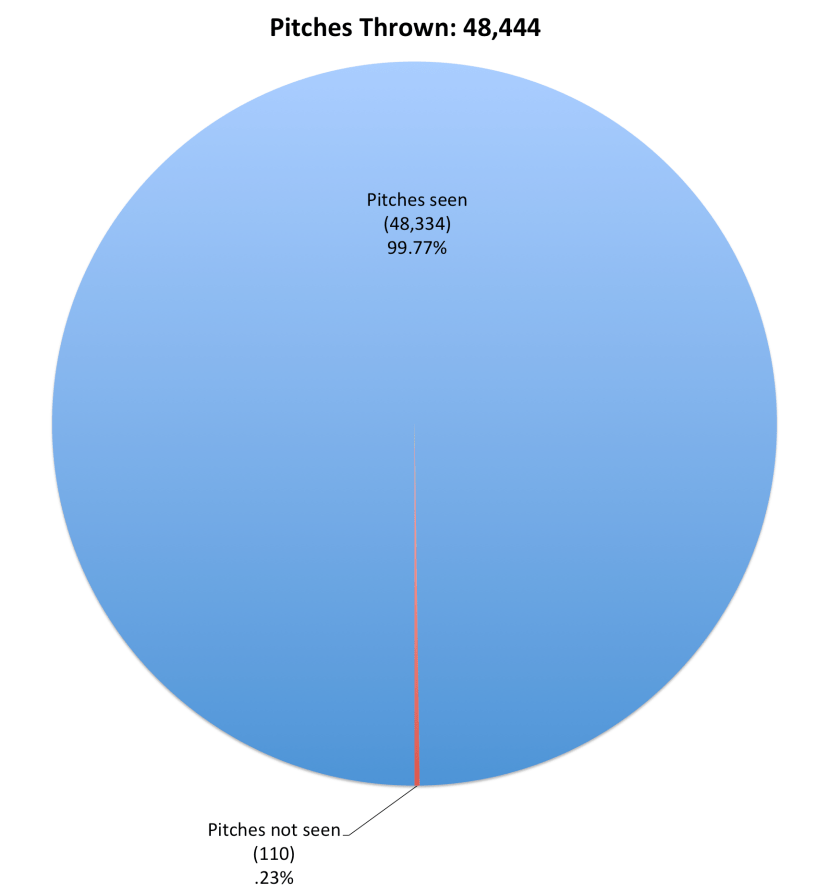 I kept track throughout the season of pitches seen. I considered seeing a pitch as actually seeing the pitcher throw the ball to the plate. One exception is if I miss the pitch but the ball is put in play and I see the resulting action of that play. This only happened a few times because most of the time I missed pitches that were balls or strikes and nothing else happened. Someone called me out one time and said that they didn’t believe my pitches seen percentage. I will admit that it is not 100% accurate. There were likely times where I was looking at my phone and looked back in time to see the pitch, not realizing that I had missed one in between. If you joined me at games you saw my dedication to not missing pitches. I pulled off countless bathroom breaks and concession stand visits without missing a pitch, and for that I thank myself for being so efficient (and other people for not being sneaky [like me] by going to the concourse with two outs and watching the rest of the inning from there). This is probably my favorite pie chart. I was in the park for every pitch of every single game, if that counts for anything. I should also note that the total of 48,444 is the most pitches a team was involved in this year. The Indians were second with 48,320.