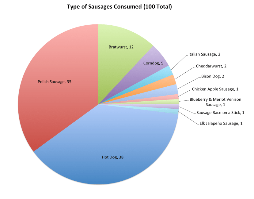 I finished the season having consumed 100 sausages. Some were very good (polish with sautéed onions at Miller Park), some were not (chicken apple sausage in San Francisco).