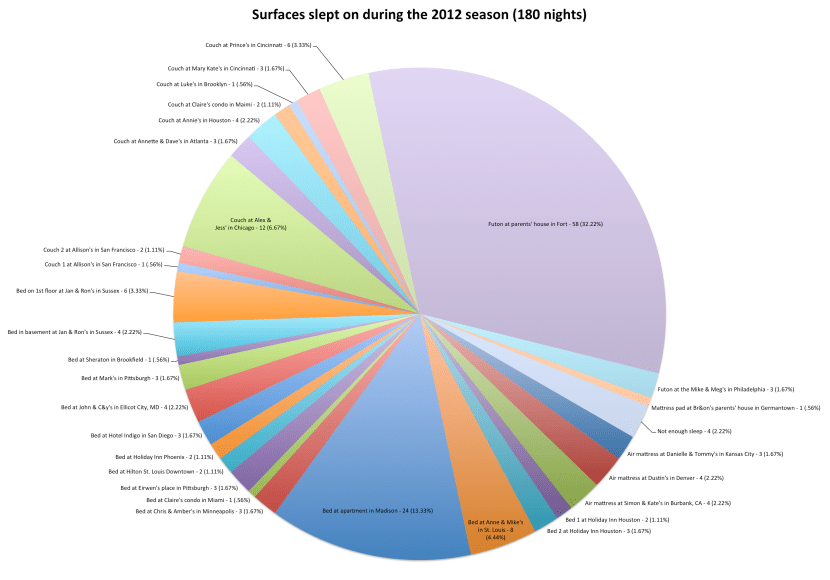 The pie chart below details where I stayed throughout the season. The number after each description is the number of times I stayed there. The percentage is pretty self explanatory, it’s out of 180 nights. Four nights out of the 180 I didn’t get enough sleep to qualify. I either didn’t get any at all or got less than an hour or two. The nights without sleep gets it’s own slice. You’re probably going to have to click on the first chart in order to read it.