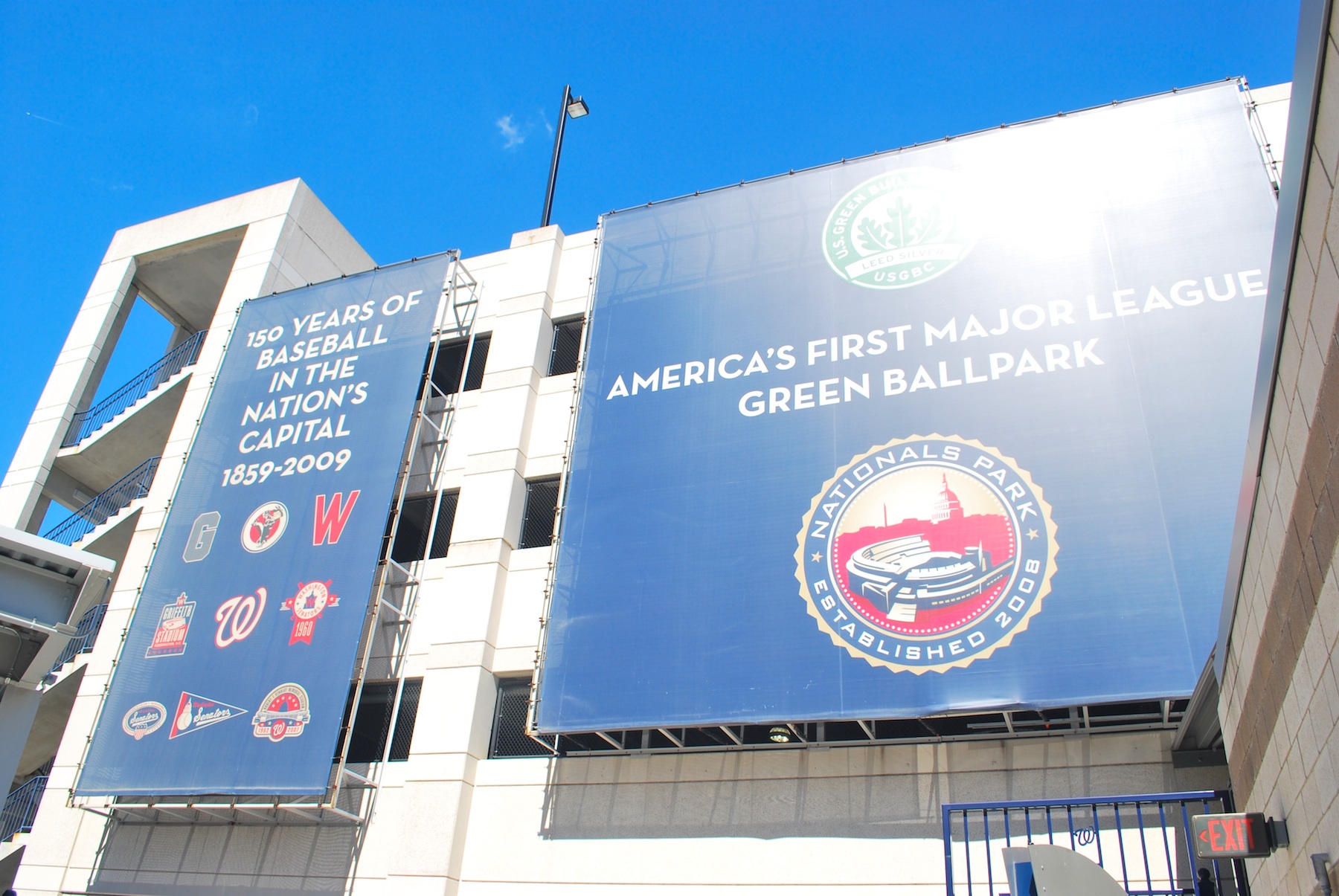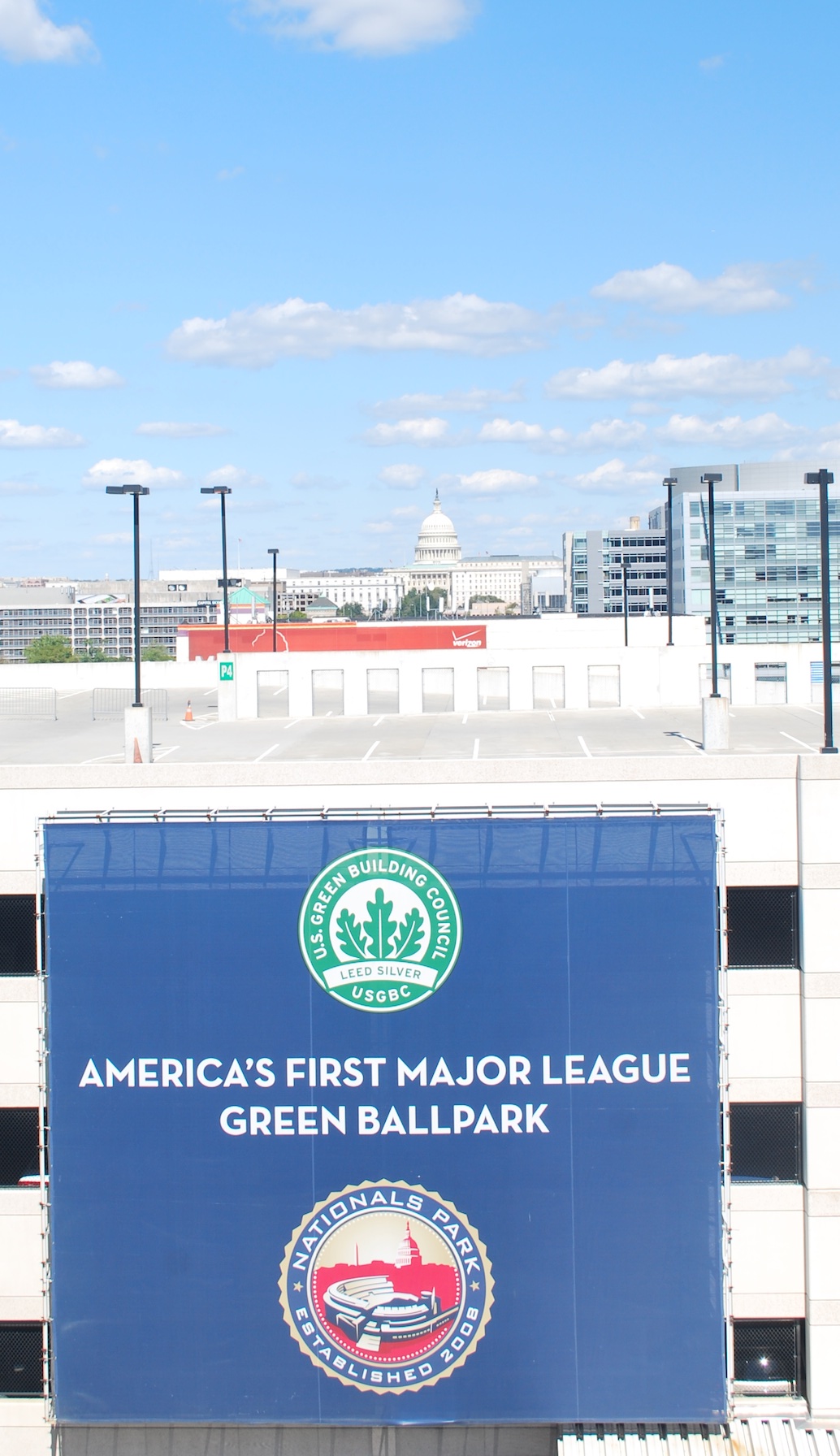 I wandered a little and noticed a few banners on the parking garage beyond the left field corner. The sun’s reflection washes out the green certification logo, but you get the picture.