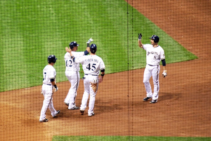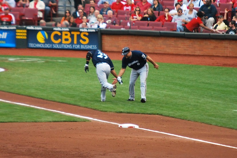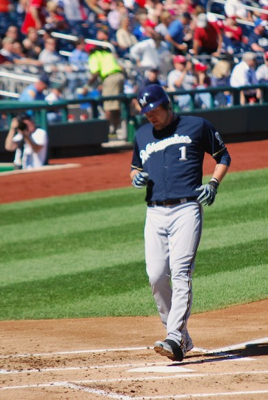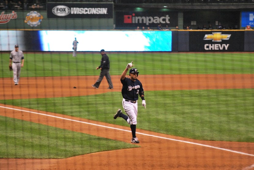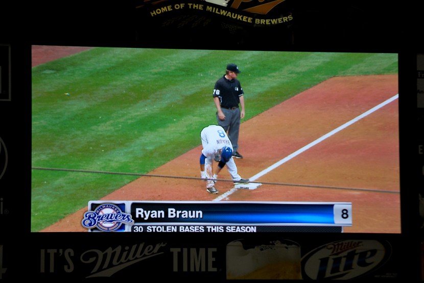 Braun stole third base for his 30th steal of the season. It’s back-to-back 30/30 seasons for Braun (30 HR / 30 steals) and only the 11th 40/30 season in MLB history. Very impressive, especially considering the scrutiny he has been greeted with this entire season. Not the best picture of Braun below, but nonetheless.