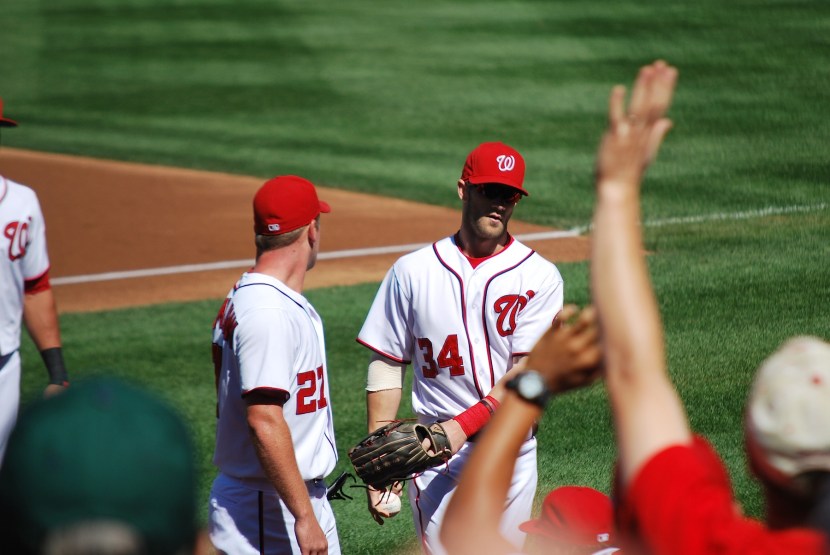 …. where it was caught by 19-year-old Bryce Harper before crashing into the wall. Kids these days, I tell ya. A few of his teammates waited on the field to show their appreciation for his efforts.