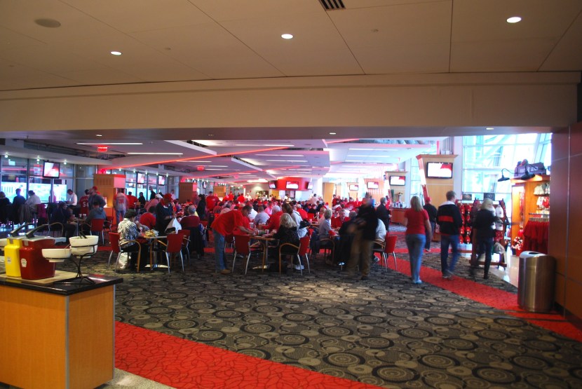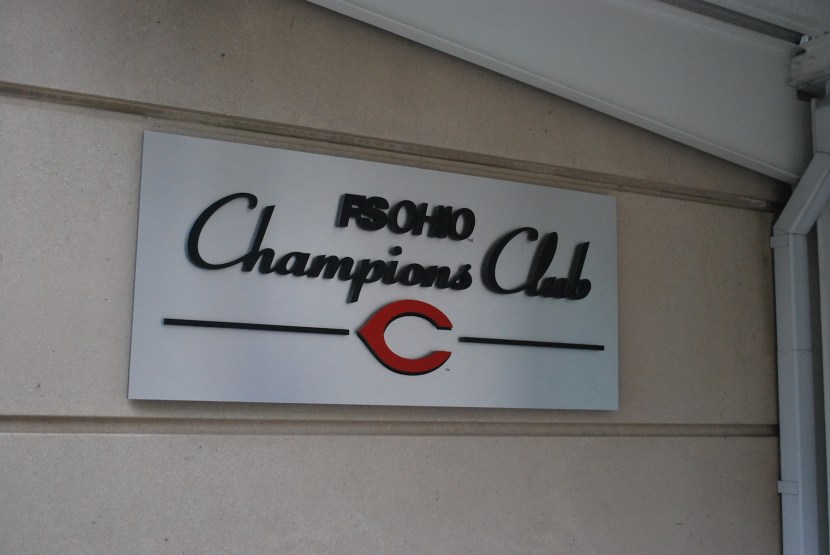 On Tuesday I slept in and then worked on the blog for Monday. I hobbled around all morning and afternoon as sleep didn’t do much for the knee. I think the jogging for a quarter mile to get my license plate may have something to do with it. Barry, who works for the Bengals, picked me up at 5:35 and we were parked 17 minutes later. We parked at Paul Brown Stadium and made the 10 minute walk to the ballpark. Barry had found a great deal on StubHub for one of the all-inclusive areas (minus alcohol). The tickets are usually $85 but he found them for $13; score! Here’s the sign on the field level concourse for the Champions Club (sponsored by FS Ohio).