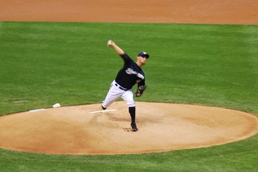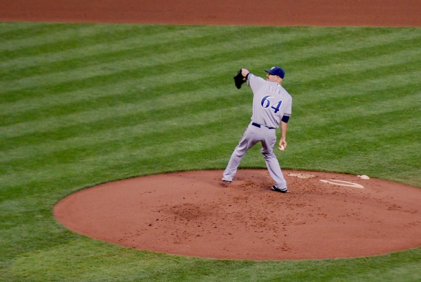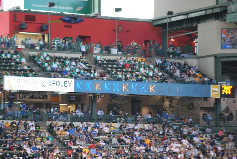I was in my seat in time for the first pitch but wasn’t prepared to take the final first pitch picture. I don’t feel bad because I didn’t start doing it until later in the year, so it’s not like this is the first time it happened. Stinson started in place of Yovani Gallardo, which greatly decreased the likelihood of seeing the necessary nine strikeouts to set the MLB team record for Ks. Here is Stinson pitching in the 1st inning.