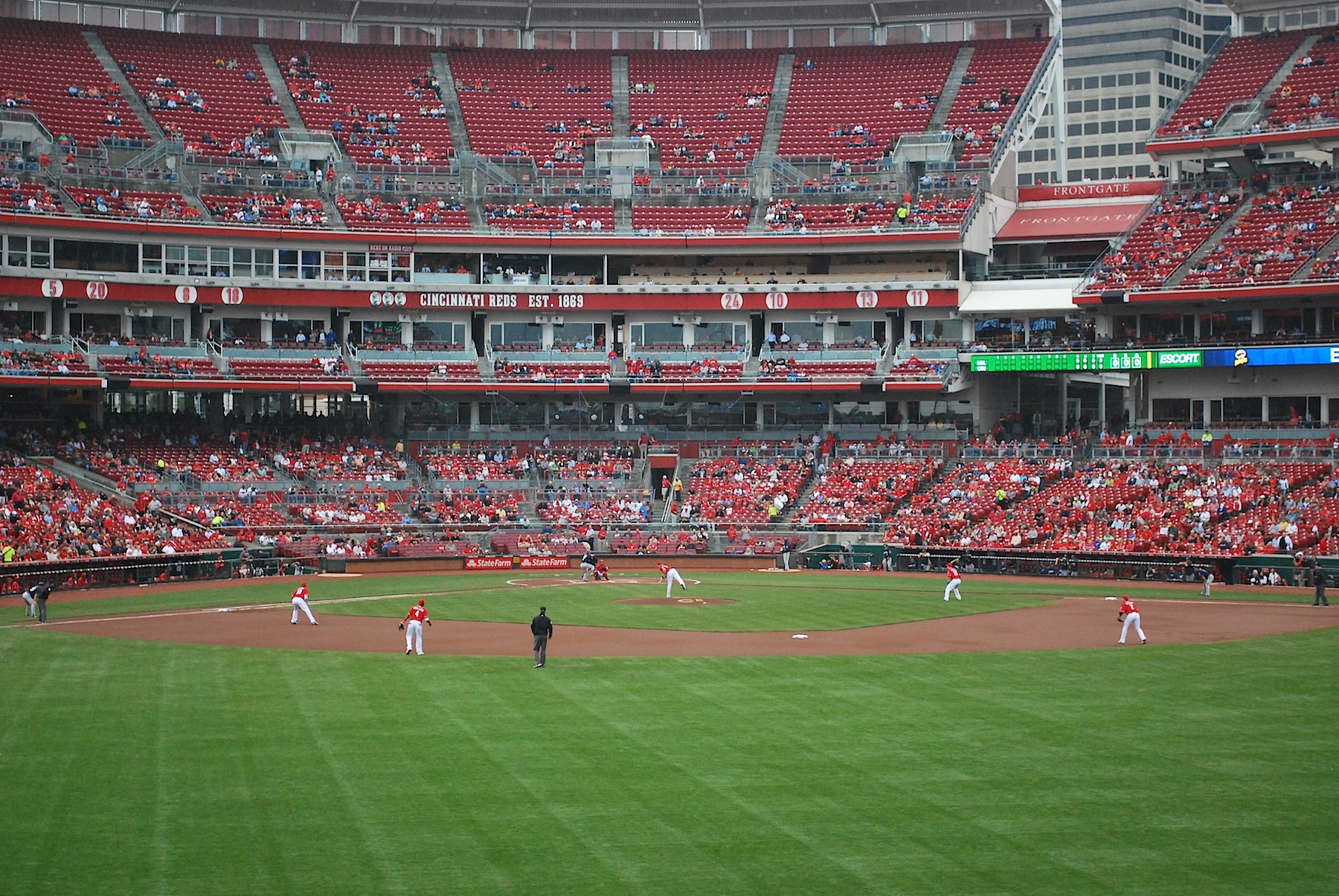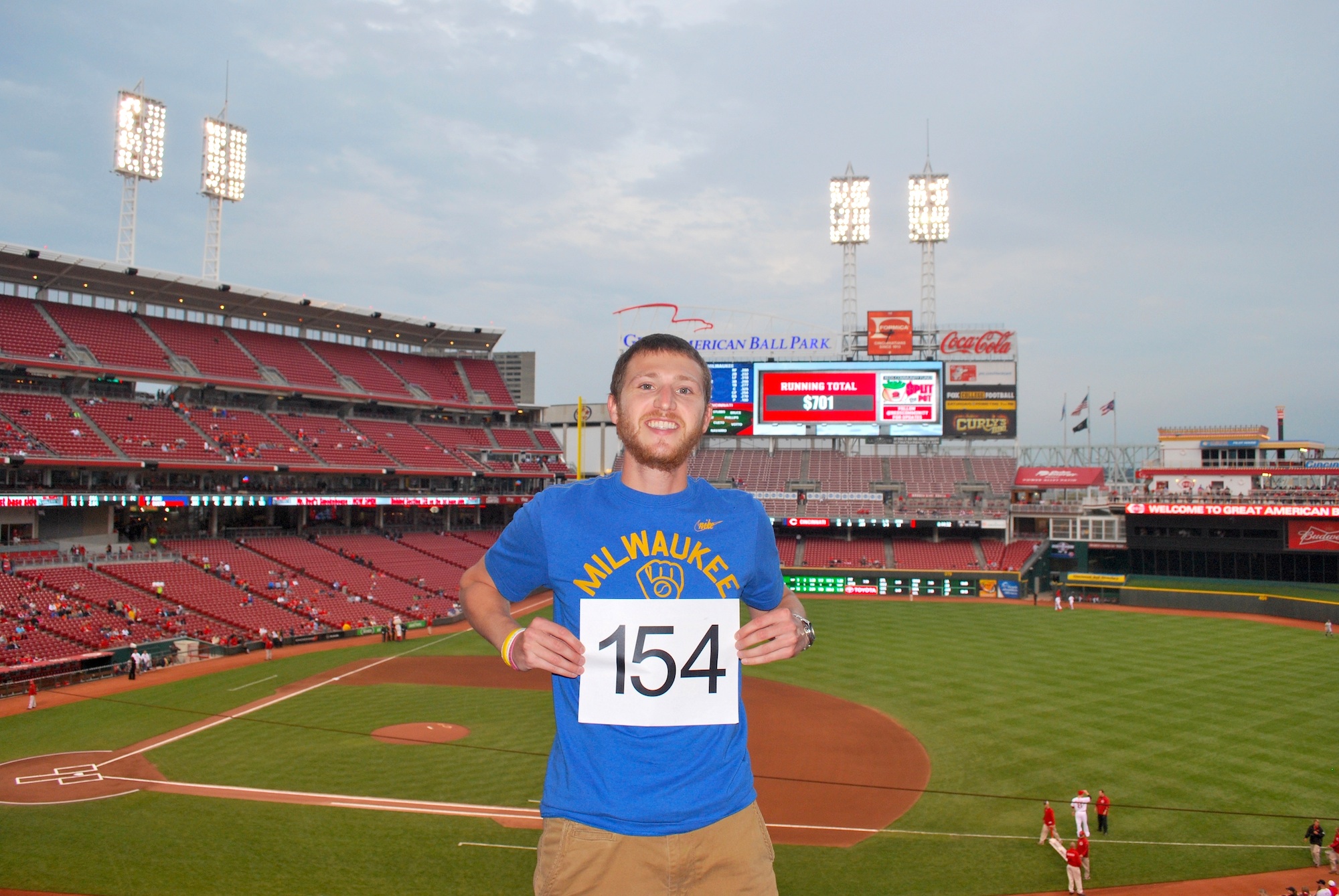 Thursday was getaway day and the Reds had scheduled a 12:35 finale. It reduces the time between games but it also gives me a 30 minute head start back to Wisconsin. I left Mary Kate’s apartment at 11:30 and was parked in one of the $10 lots 15 minutes later. I picked up my ticket from will call and was inside Great American Ballpark by noon. I had already taken 8 game number pictures from inside and outside of the park so I had some trouble deciding where I wanted it taken. I ended up going to the top row of seats beyond the right field wall. There was no one within 15 rows of me and I tried propping my camera up like I had in Pittsburgh but it didn’t work too well. Shortly before the national anthem I gave up, walked down the steps to the nearest fan (Mike), and asked him politely if he could help me out. He’s a season seat holder and was very interested in my mission and was nice as could be. Thanks Mike!