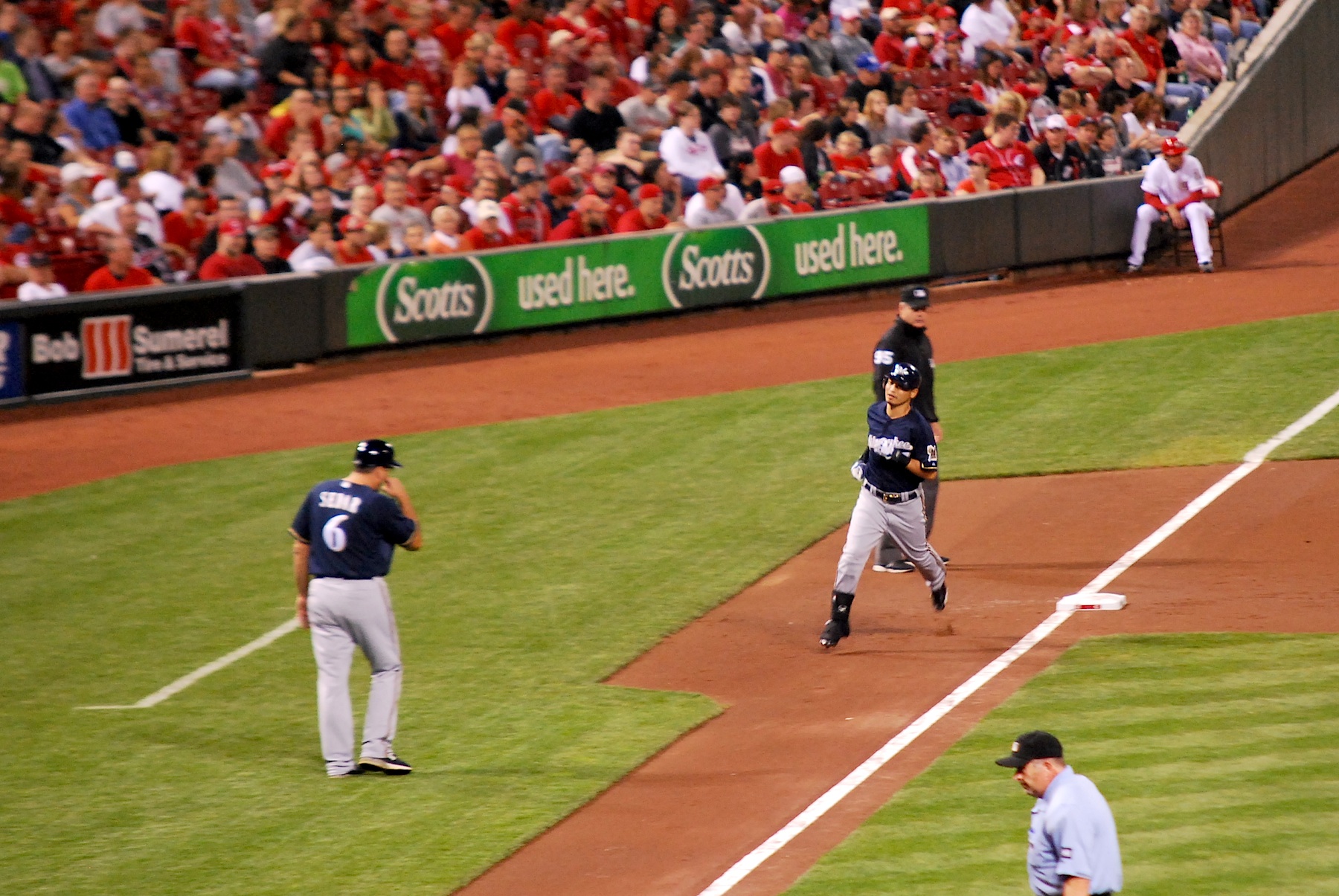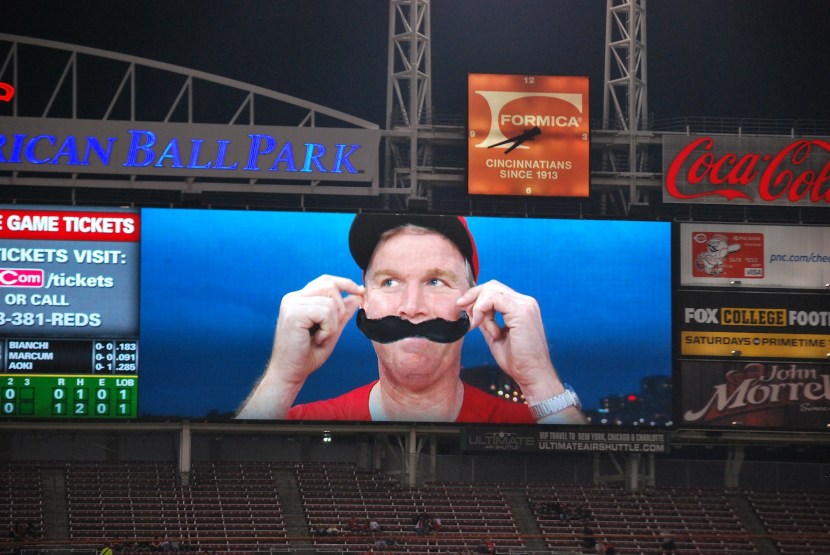 The Reds scored a solo run in the bottom of the 1st but Marcum pitched better after that frame. In the 3rd Aoki homered with two outs and it was a laser that appeared to not get higher than 30 feet in the air (we’ll see what the apex is listed at when hittrackeronline updates their database). I looked this morning and they say it reached 56 feet at it’s apex, hmmmmmm. I took the picture just before Aoki did the finger mustache gesture, but you can see third base coach Ed Sedar doing it.