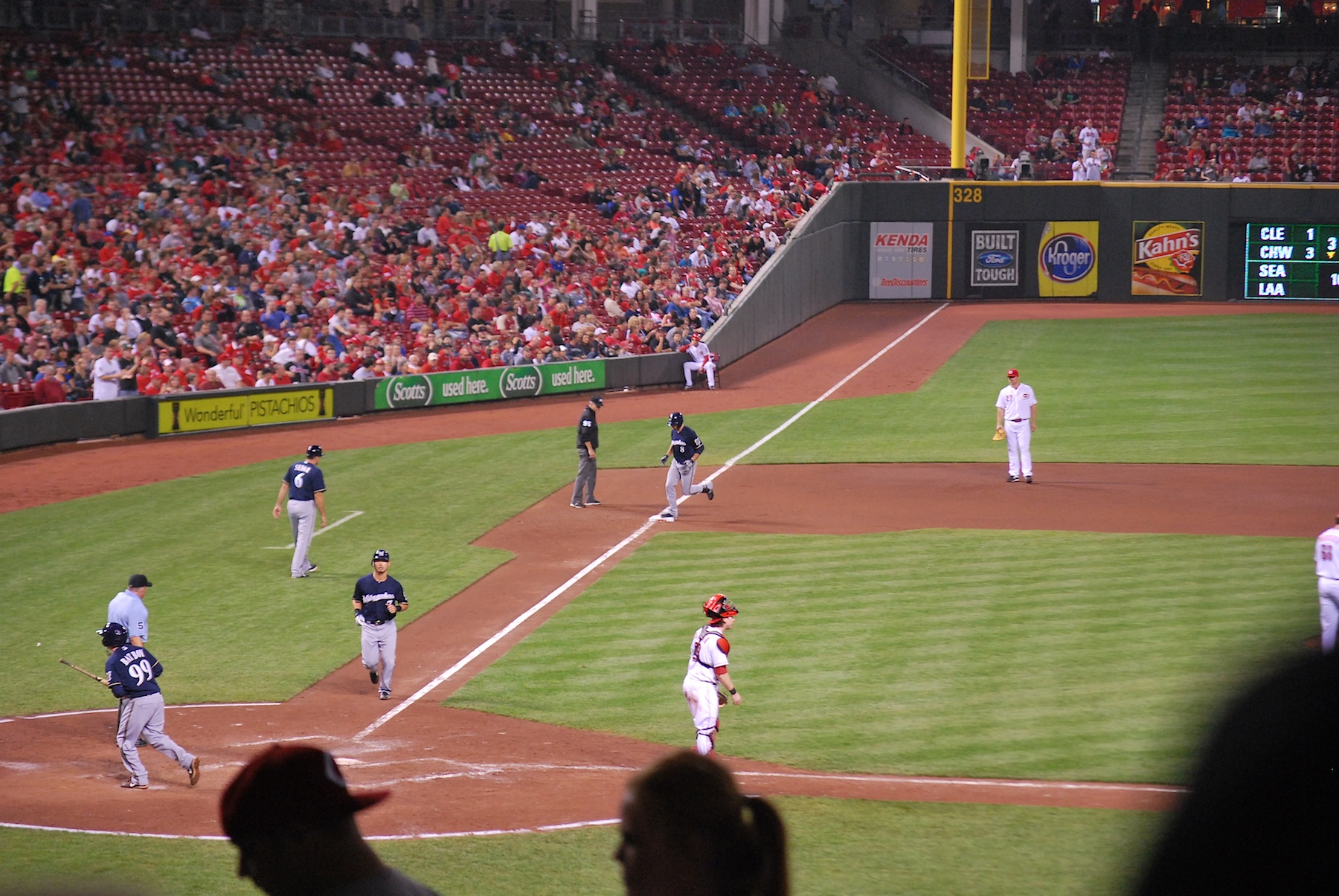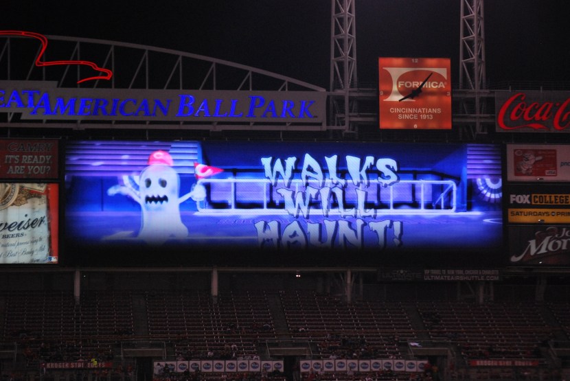 2) “Walks will haunt!” The Reds put this on the scoreboard after a visiting team walks one of the Reds batters. It’s true, but after doing some brief research I’ve noticed there are some conflicting numbers. One website says a leadoff walk scores 38% of the time while another says 80% of the time. Interesting…… I had thought it was in the 70% range but I’ll keep digging. Either way, walks are bad so the scoreboard message is accurate (just ask the Brewers’ bullpen about the first 4.5 months of the season).