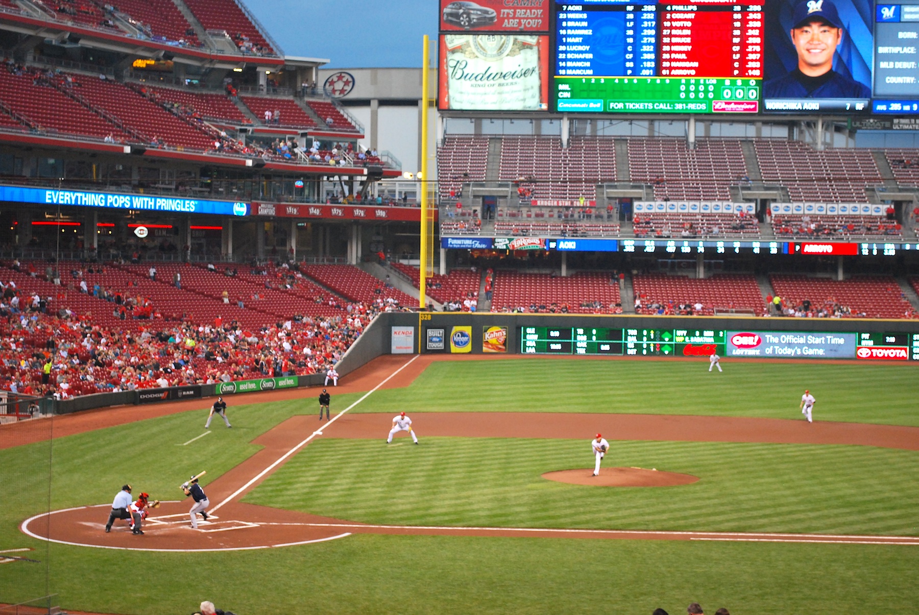 The game started at 7:10 and Norichika Aoki took a ball from Reds starter Johnny Cueto.