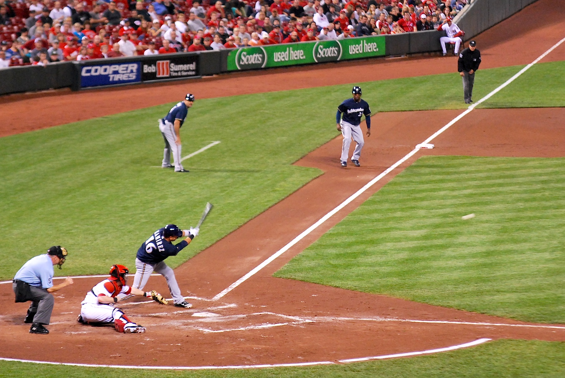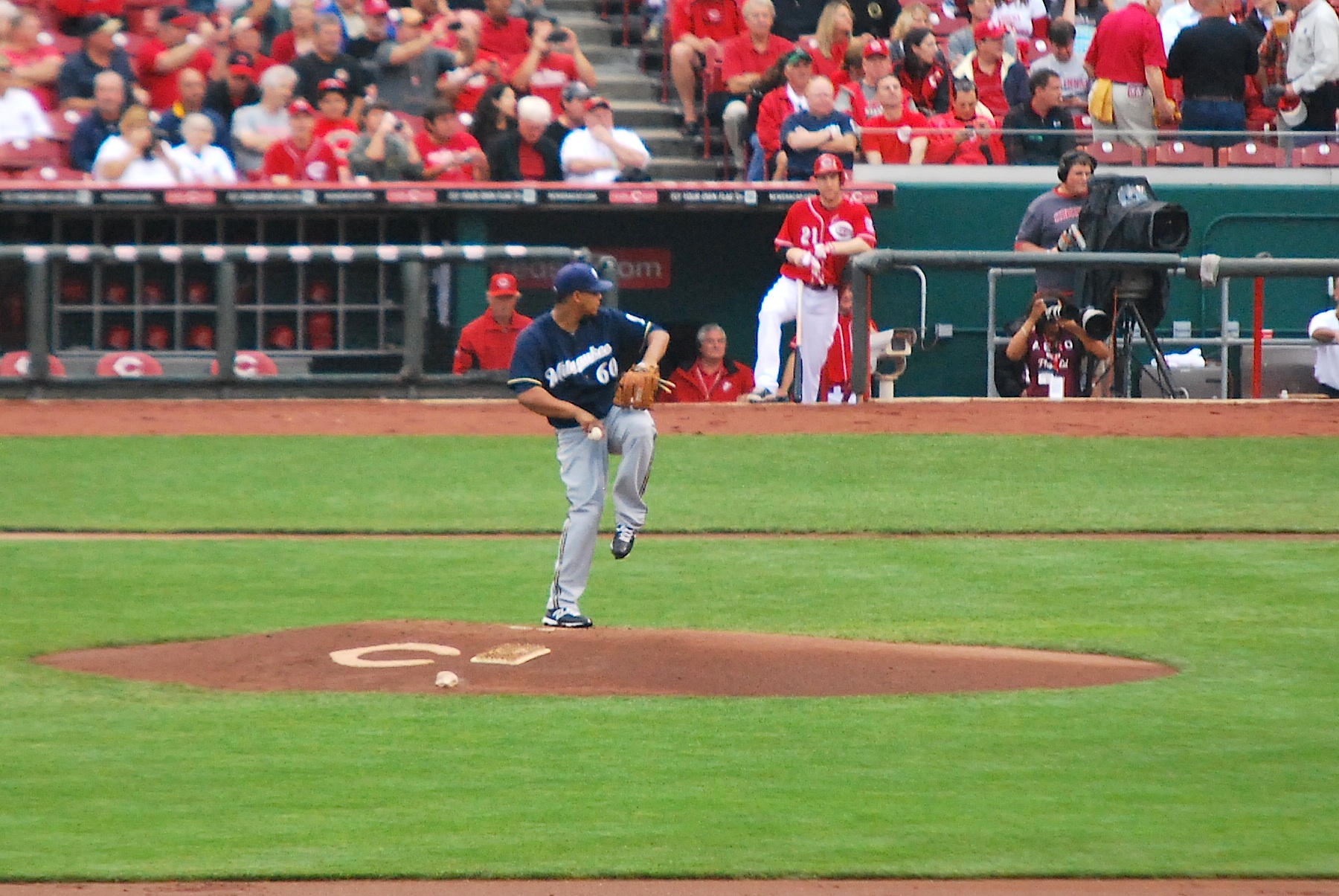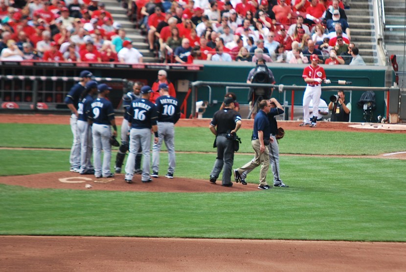 Bang! Wish granted. Gomez sent the 1-1 pitch over the wall in right field to give the Brewers a 1-0 lead. In the bottom of the 6th Wily Peralta struck out Reds starter Mat Latos. When the Brewers threw the ball around the horn after the strikeout Aramis Ramirez hung onto the ball and called out the trainer. Apparently Ramirez had pointed something out to Roenicke earlier in the game about Peralta and they had kept an eye on him. Roenicke and the trainer came out of the dugout in the 6th and Peralta was pulled from the game. It’s said to be a biceps issue but it doesn’t appear to be too serious.