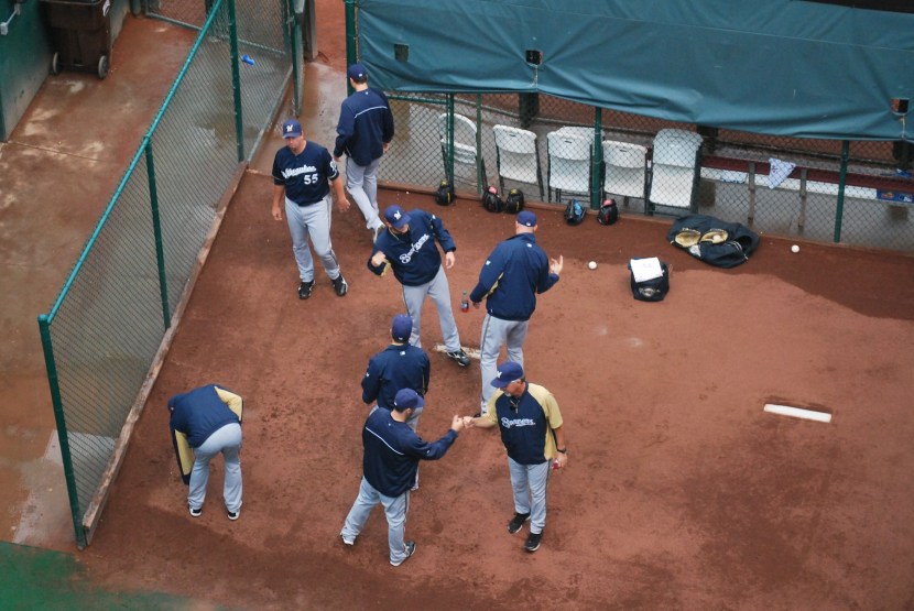 The Brewers relievers had just made their way out to the bullpen so I went over to the edge of the stands to get a few pictures of their handshakes. Most of them have specific handshakes with each other, and it’s fun to watch. I remember seeing them do a handshake routine with some Miller Park staffers last season. It involved a handshake and then a sweeping [the floor] gesture while whistling. Oh the bullpen.