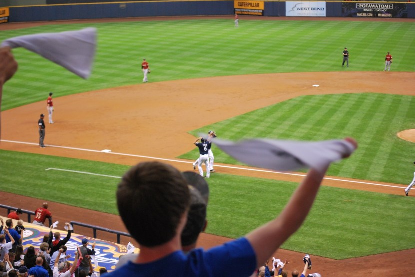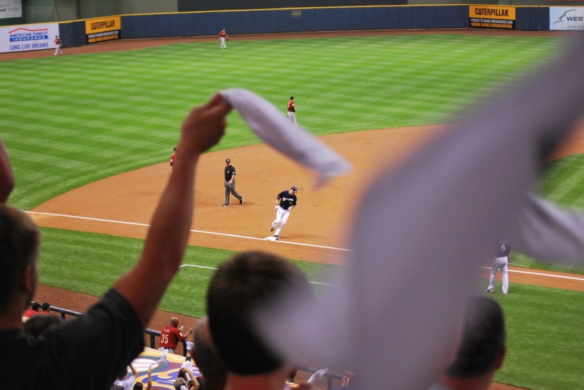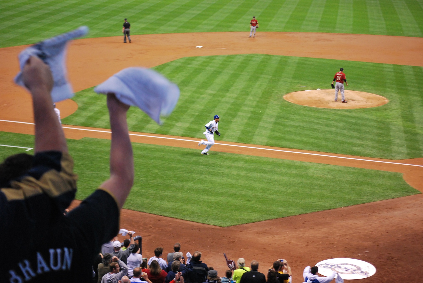 The game didn’t stay tied for long and in the 4th the Astros put a 2-spot on the board and duplicated the effort in the 5th. The latter coming on back-to-back home runs from Brett Wallace and Jason Castro. In the bottom of the 6th Braun doubled home Ishikawa and Weeks, and the deficit was now two at 5-3. I tried to capture all of the towel waving after Braun’s double but it’s kind of hard to see.