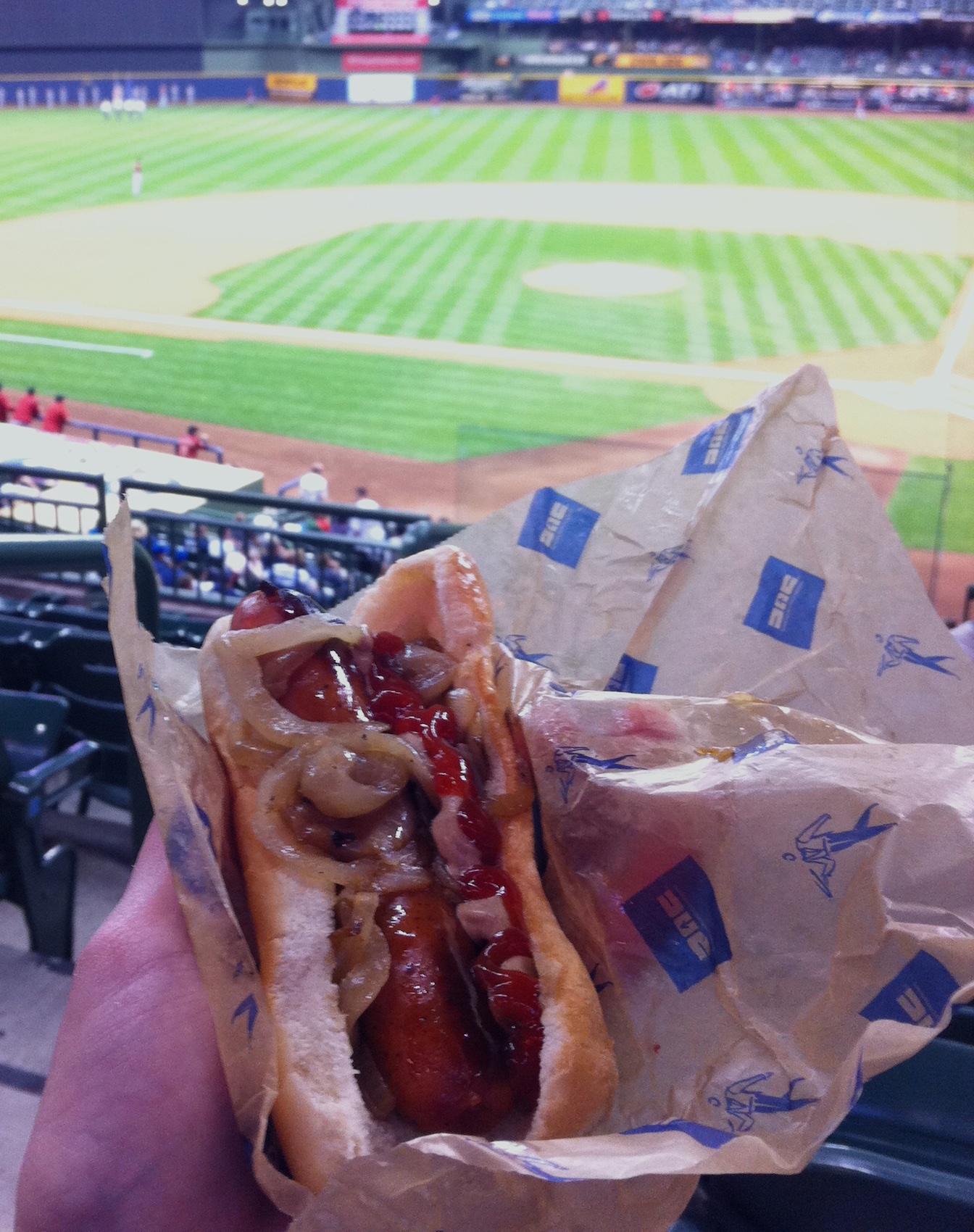 The Brewers held the 1-0 lead and I slowly made my way around the concourse towards the right field corner. I had a hot dog along the way and the concession stand worker took my money with her gloves on. She then proceeded to pick up the bun and serve me the hot dog. Interesting… I considered saying something to her but I didn’t. I did stop by guest relations to let them know about the infraction. The lady at guest relations said that I should’ve said something. So I’m supposed to be a fan at the game and serve as the disciplinarian for the concession workers. Right……..