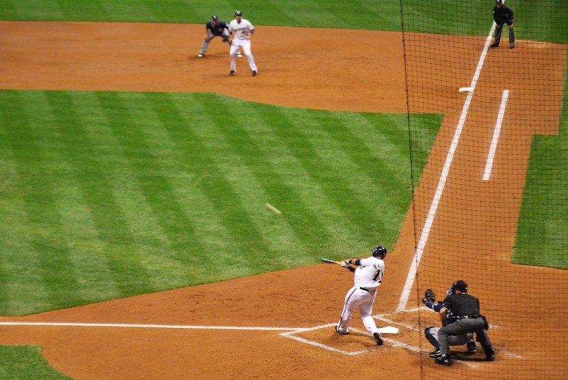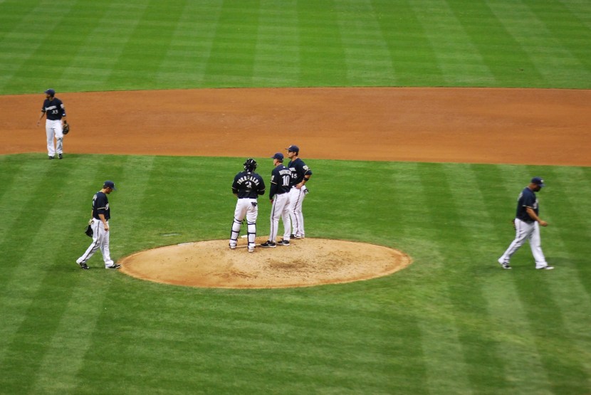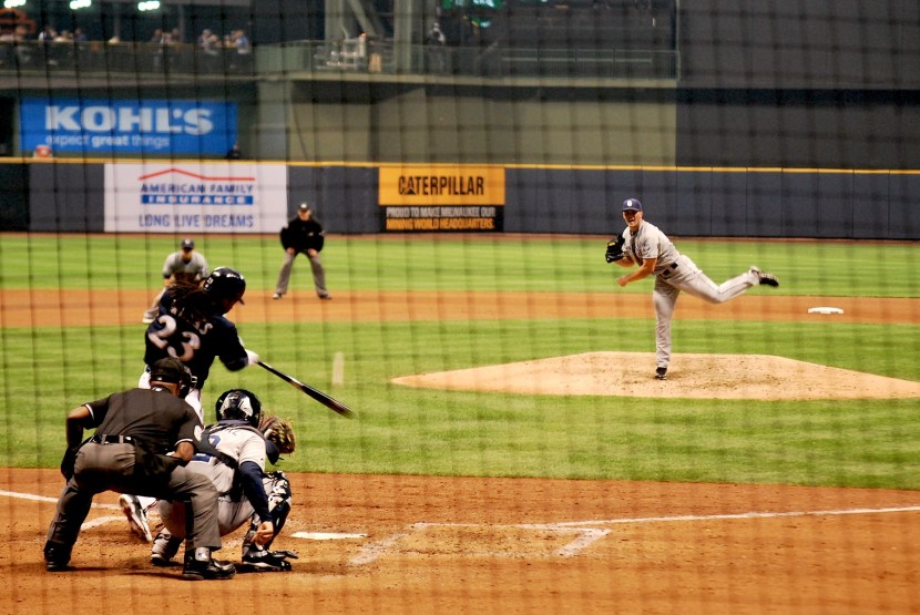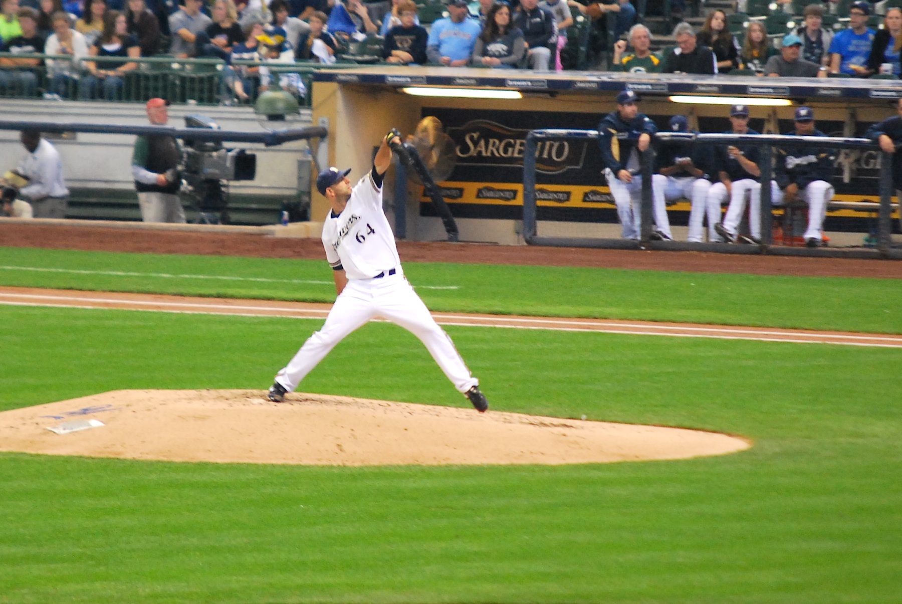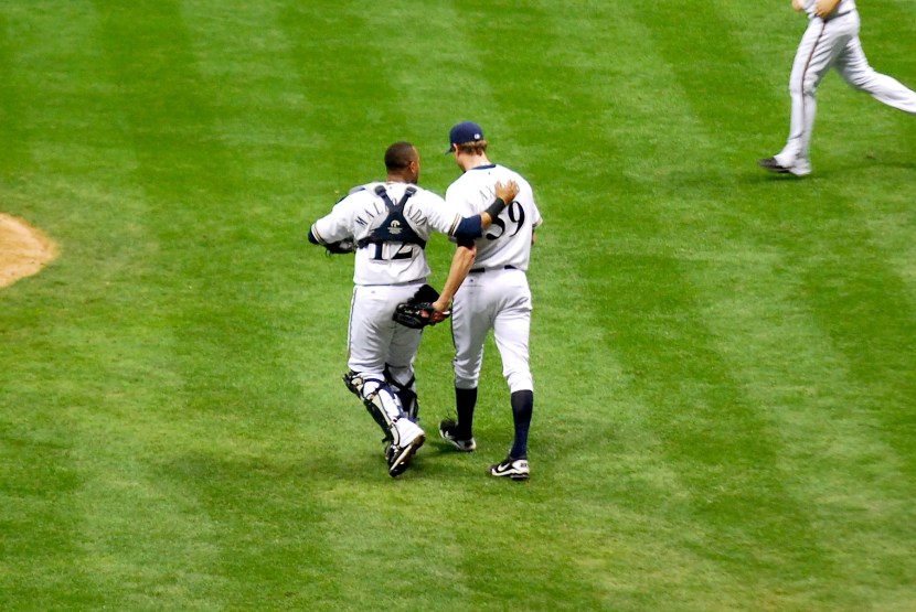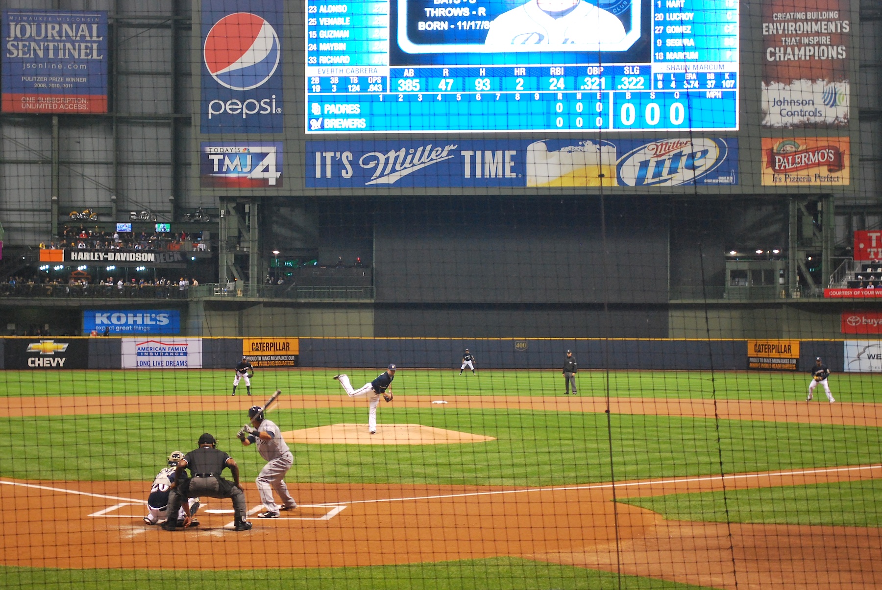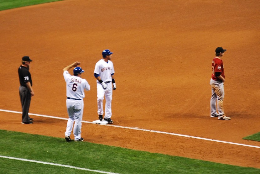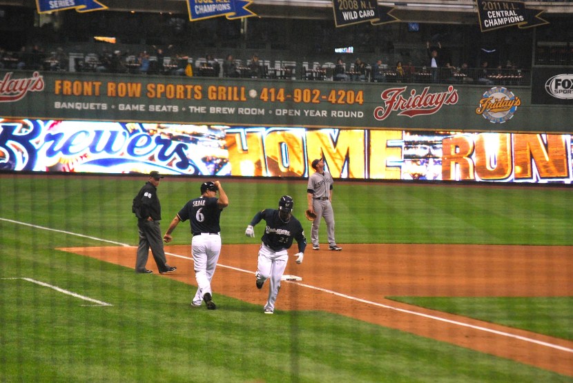 In the bottom of the 1st Braun doubled and Aramis Ramirez drove him in with a single. In the top of the 3rd inning Padres starter Clayton Richard hit his first major league home run. On consecutive days a Brewers starter gave up a first career home run to the opposing starter. It’s probably been done before but I’m guessing it’s not a very common occurrence. Carlos Gomez gave the lead back to the Brewers with a solo home run in the bottom of the 4th. The umpire in the background is picking something up and I’m assuming it was something that fell off of Gomez, maybe part of his elbow guard? Either that or a horse was on the field and left a gift for one of the umpires (horses don’t like bad calls).